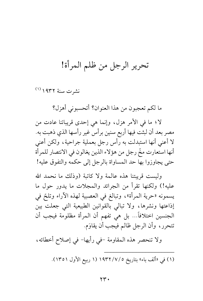 وليست قريبتنا هذه عالمة ولا كاتبة (وذلك ما نحمد الله عليه!) ولكنها تقرأ من الجرائد والمجلات ما يدور حول ما يسمونه «حرية المرأة»، وتبالغ في العصبية لهذه الآراء وتلحّ في إذاعتها ونشرها، ولا تبالي بالقوانين الطبيعية التي جعلت بين الجنسين اختلافاً ... بل هي تفهم أن المرأة مظلومة فيجب أن تتحرر، وأن الرجل ظالم فيجب أن يقاوَم.