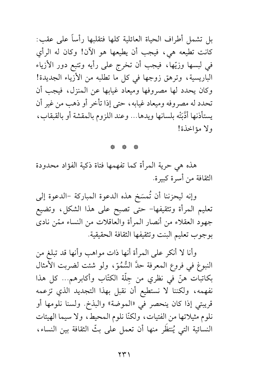 وأنا لا أنكر على المرأة أنها ذات مواهب وأنها قد تبلغ من النبوغ في فروع المعرفة حدَّ السُّمُوّ، ولو شئت لضربت الأمثال بكاتبات هنّ في نظري من جِلّة الكتّاب وأكابرهم ... كل هذا نفهمه، ولكننا لا نستطيع أن نقبل بهذا التجديد الذي تزعمه قريبتي إذا كان ينحصر في «الموضة» والبذخ. ولسنا نلومها أو نلوم مثيلاتها من الفتيات، ولكنّا نلوم المحيط، ولا سيما الهيئات النسائية التي يُنتظَر منها أن تعمل على بثّ الثقافة بين النساء،