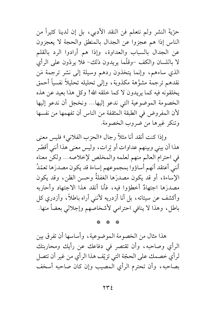 حرّيةَ النشر ولم نتعلم فن النقد الأدبي، بل إن لدينا كثيراً من الناس إذا هم عجزوا عن الجدال بالمنطق والحجة لا يعجزون عن الجدال بالسباب والعداوة، وإذا هم أرادوا الرد بالقلم لا باللسان والكف -وقلّما يريدون ذلك- فلا يردّون على الرأي الذي ساءهم، وإنما يتخذون ردهم وسيلة إلى نشر ترجمة مَن نقدهم ترجمة مشوَّهة مكذوبة، وإلى تحليله تحليلاً نفسياً أحمق يخلقونه فيه كما يريدون لا كما خلقه الله! وكل هذا بعيد عن هذه الخصومة الموضوعية التي ندعو إليها ... ونخجل أن ندعو إليها لأن المفروض في الطبقة المثقفة من الناس أن تفهمها من نفسها وتنكر غيرها من ضروب الخصومة.