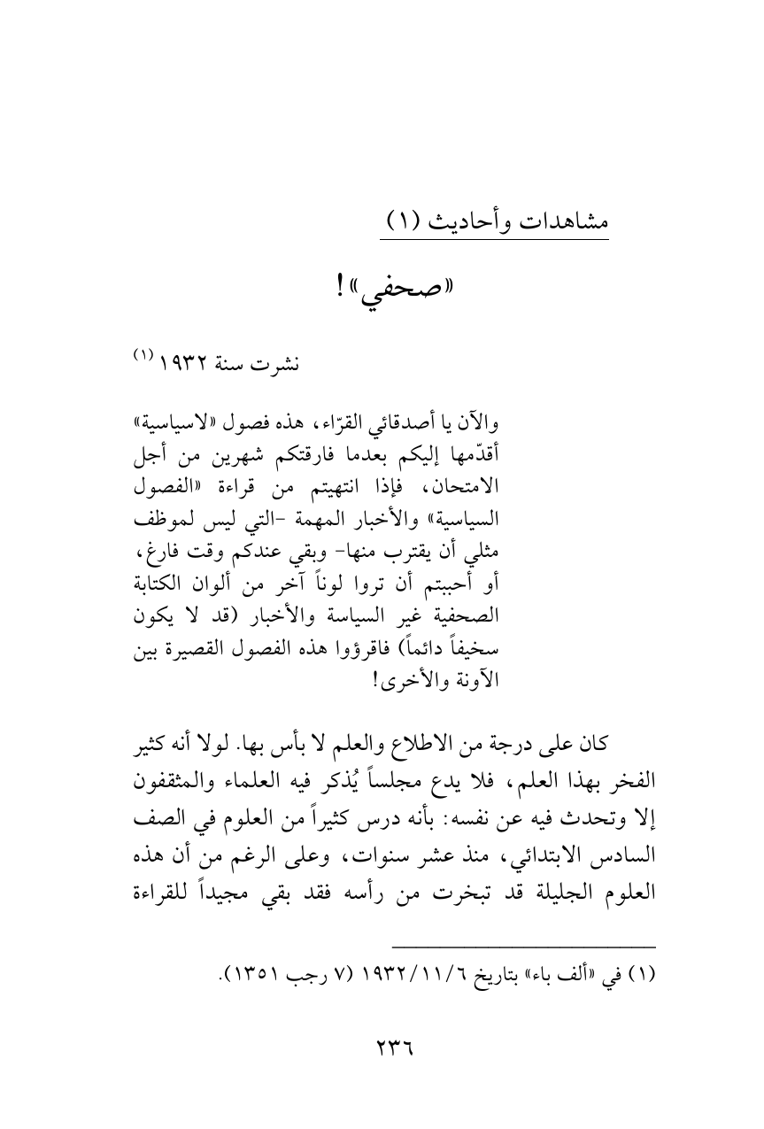[والآن يا أصدقائي القرّاء، هذه فصول «لاسياسية» أقدّمها إليكم بعدما فارقتكم شهرين من أجل الامتحان، فإذا انتهيتم من قراءة «الفصول السياسية» والأخبار المهمة -التي ليس لموظف مثلي أن يقترب منها- وبقي عندكم وقت فارغ، أو أحببتم أن تروا لوناً آخر من ألوان الكتابة الصحفية غير السياسة والأخبار (قد لا يكون سخيفاً دائماً) فاقرؤوا هذه الفصول القصيرة بين الآونة والأخرى!]