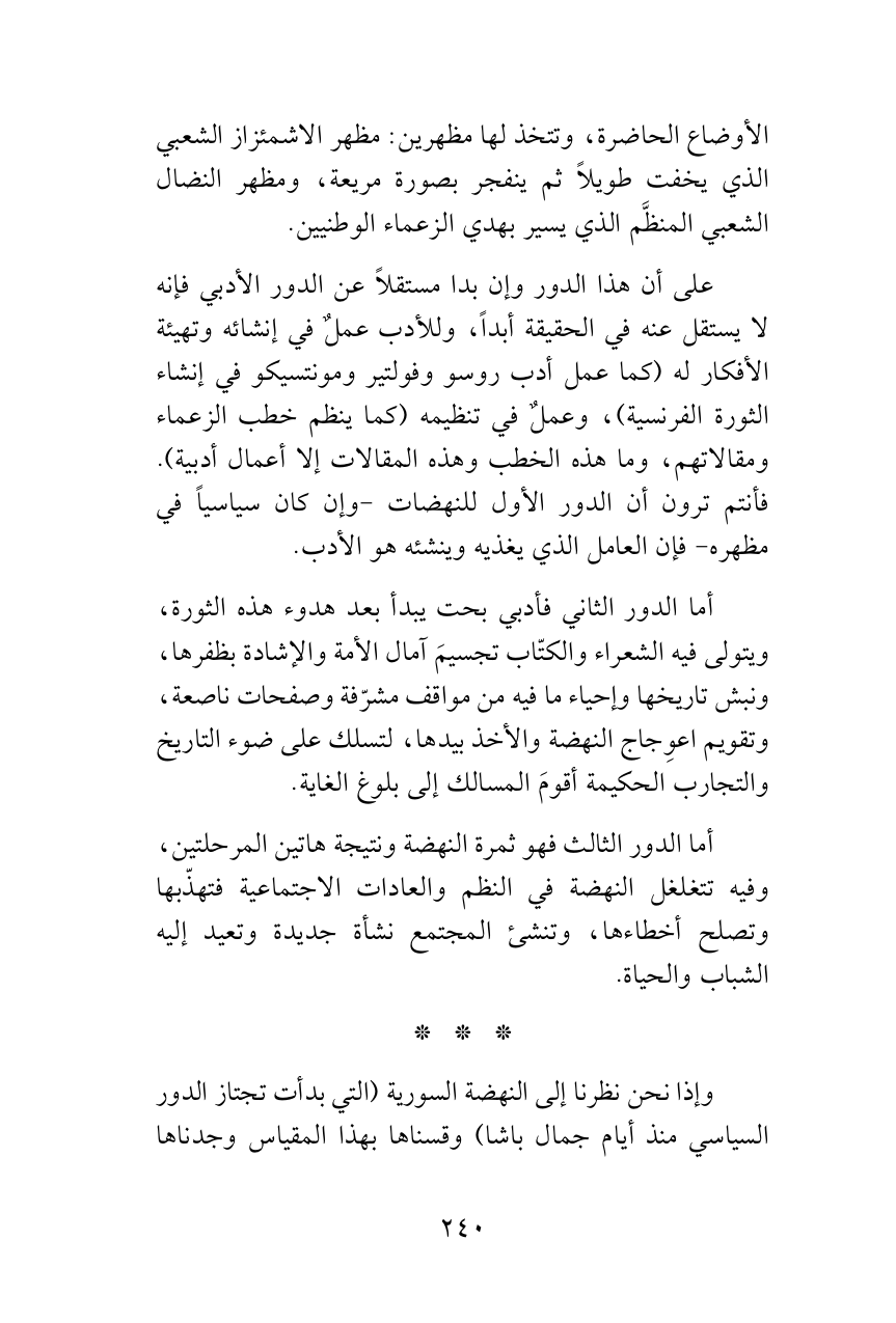على أن هذا الدور وإن بدا مستقلاً عن الدور الأدبي فإنه لا يستقل عنه في الحقيقة أبداً، وللأدب عملٌ في إنشائه وتهيئة الأفكار له (كما عمل أدب روسو وفولتير ومونتسيكو في إنشاء الثورة الفرنسية)، وعملٌ في تنظيمه (كما ينظم خطب الزعماء ومقالاتهم، وما هذه الخطب وهذه المقالات إلا أعمال أدبية). فأنتم ترون أن الدور الأول للنهضات -وإن كان سياسياً في مظهره- فإن العامل الذي يغذيه وينشئه هو الأدب.
