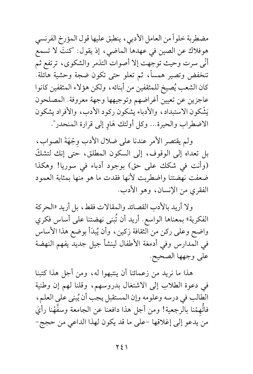 ولم يقتصر الأمر عندنا على ضلال الأدب وِجْهَةَ الصواب، بل تعداه إلى الوقوف، إلى السكون المطلق، حتى إنك لتشكّ (وأنت في شكك على حق) بوجود أدباء في سوريا! وهكذا ضعفت نهضتنا واضطربت لأنها فقدت ما هو منها بمثابة العمود الفقري من الإنسان، وهو الأدب.