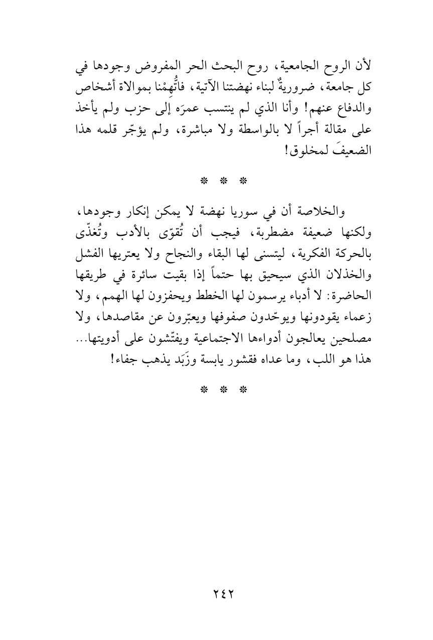 لأن الروح الجامعية، روح البحث الحر المفروض وجودها في كل جامعة، ضروريةٌ لبناء نهضتنا الآتية، فاتُّهِمْنا بموالاة أشخاص والدفاع عنهم! وأنا الذي لم ينتسب عمرَه إلى حزب ولم يأخذ على مقالة أجراً لا بالواسطة ولا مباشرة، ولم يؤجّر قلمه هذا الضعيفَ لمخلوق!