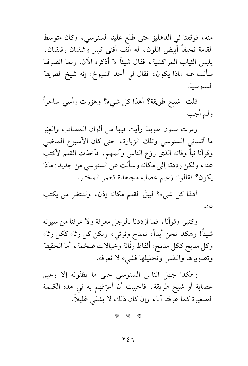 وهكذا جهل الناس السنوسي حتى ما يظنّونه إلا زعيم عصابة أو شيخ طريقة، فأحببت أن أعرّفهم به في هذه الكلمة الصغيرة كما عرفته أنا، وإن كان ذلك لا يشفي غليلاً.