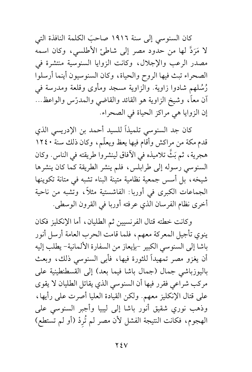 كان السنوسي إلى سنة 1916 صاحبَ الكلمة النافذة التي لا مَرَدَّ لها من حدود مصر إلى شاطئ الأطلسي، وكان اسمه مصدر الرعب والإجلال، وكانت الزوايا السنوسية منتشرة في الصحراء تبث فيها الروح والحياة، وكان السنوسيون أينما أرسلوا رُسُلهم شادوا زاوية. والزاوية مسجد ومأوى وقلعة ومدرسة في آن معاً، وشيخ الزاوية هو القائد والقاضي والمدرّس والواعظ ... إن الزوايا هي مراكز الحياة في الصحراء.