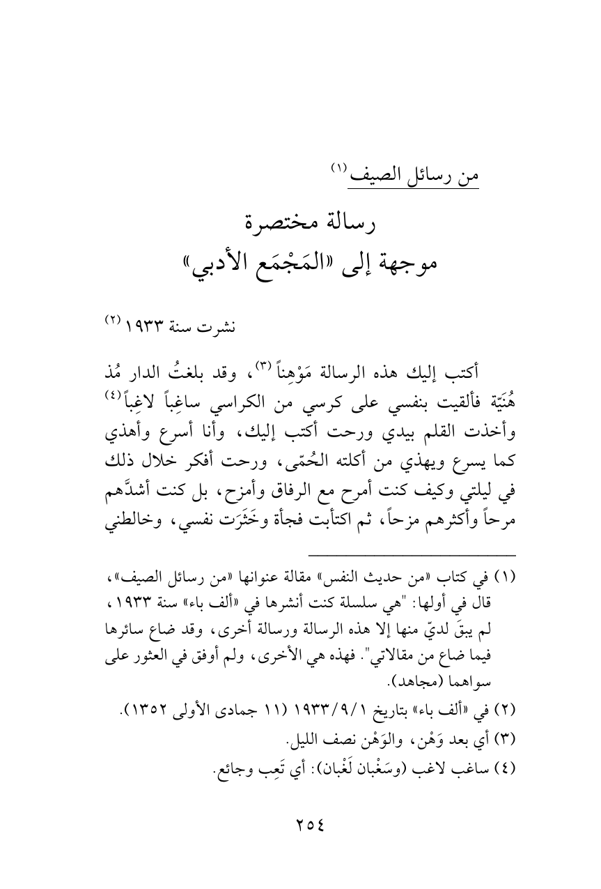 (¬1) في كتاب «من حديث النفس» مقالة عنوانها «من رسائل الصيف»، قال في أولها: "هي سلسلة كنت أنشرها في «ألف باء» سنة 1933، لم يبقَ لديّ منها إلا هذه الرسالة ورسالة أخرى، وقد ضاع سائرها فيما ضاع من مقالاتي". فهذه هي الأخرى، ولم أوفق في العثور على سواهما (مجاهد).