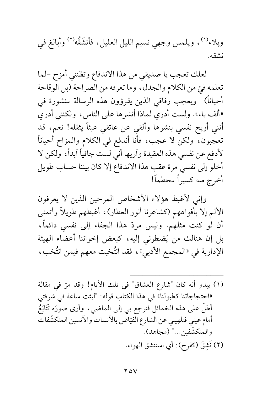 لعلك تعجب يا صديقي من هذا الاندفاع وتظنني أمزح -لما تعلمه فيّ من الكلام والجدل، وما تعرفه من الصراحة (بل الوقاحة أحياناً) - ويعجب رفاقي الذين يقرؤون هذه الرسالة منشورة في «ألف باء». ولست أدري لماذا أنشرها على الناس، ولكنني أدري أنني أريح نفسي بنشرها وألقي عن عاتقي عبئاً يثقله! نعم، قد تعجبون، ولكن لا عجب، فأنا أندفع في الكلام والمزاح أحياناً لأدفع عن نفسي هذه العقيدة وأريها أني لست جافياً أبداً، ولكن لا أخلو إلى نفسي مرة عقب هذا الاندفاع إلا كان بيننا حساب طويل أخرج منه كسيراً محطماً!