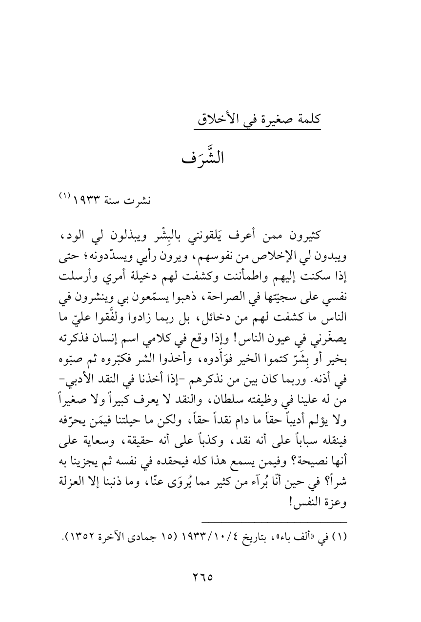 كثيرون ممن أعرف يَلقونني بالبِشْر ويبذلون لي الود، ويبدون لي الإخلاص من نفوسهم، ويرون رأيي ويسدّدونه؛ حتى إذا سكنت إليهم واطمأننت وكشفت لهم دخيلة أمري وأرسلت نفسي على سجيّتها في الصراحة، ذهبوا يسمّعون بي وينشرون في الناس ما كشفت لهم من دخائل، بل ربما زادوا ولفَّقوا عليّ ما يصغّرني في عيون الناس! وإذا وقع في كلامي اسم إنسان فذكرته بخير أو بِشَرّ كتموا الخير فوَأَدوه، وأخذوا الشر فكبّروه ثم صبّوه في أذنه. وربما كان بين من نذكرهم -إذا أخذنا في النقد الأدبي- من له علينا في وظيفته سلطان، والنقد لا يعرف كبيراً ولا صغيراً ولا يؤلم أديباً حقاً ما دام نقداً حقاً، ولكن ما حيلتنا فيمَن يحرّفه فينقله سباباً على أنه نقد، وكذباً على أنه حقيقة، وسعاية على أنها نصيحة؟ وفيمن يسمع هذا كله فيحقده في نفسه ثم يجزينا به شراً؟ في حين أنّا بُرآء من كثير مما يُروَى عنّا، وما ذنبنا إلا العزلة وعزة النفس!