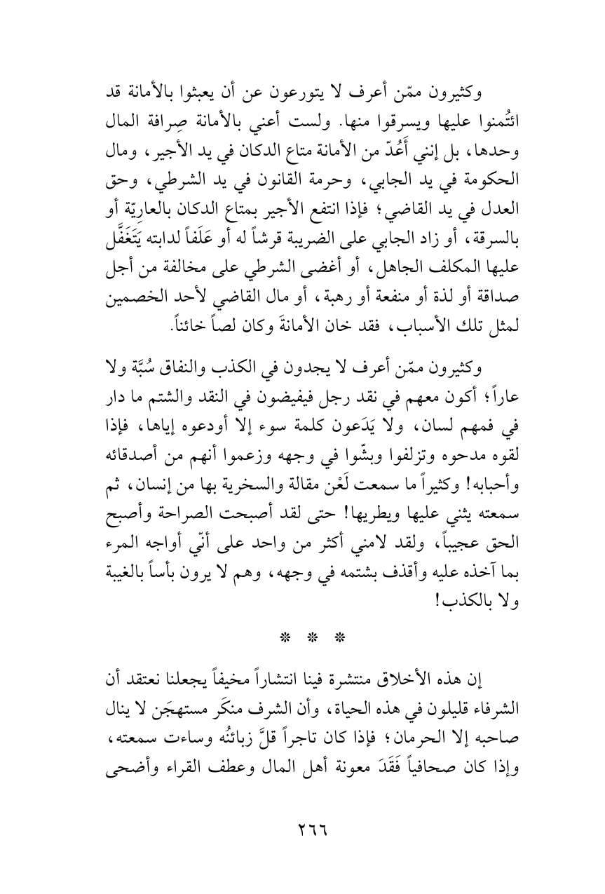 وكثيرون ممّن أعرف لا يتورعون عن أن يعبثوا بالأمانة قد ائتُمنوا عليها ويسرقوا منها. ولست أعني بالأمانة صِرافة المال وحدها، بل إنني أَعُدّ من الأمانة متاع الدكان في يد الأجير، ومال الحكومة في يد الجابي، وحرمة القانون في يد الشرطي، وحق العدل في يد القاضي؛ فإذا انتفع الأجير بمتاع الدكان بالعارِيّة أو بالسرقة، أو زاد الجابي على الضريبة قرشاً له أو عَلَفاً لدابته يَتَغَفَّل عليها المكلف الجاهل، أو أغضى الشرطي على مخالفة من أجل صداقة أو لذة أو منفعة أو رهبة، أو مال القاضي لأحد الخصمين لمثل تلك الأسباب، فقد خان الأمانةَ وكان لصاً خائناً.