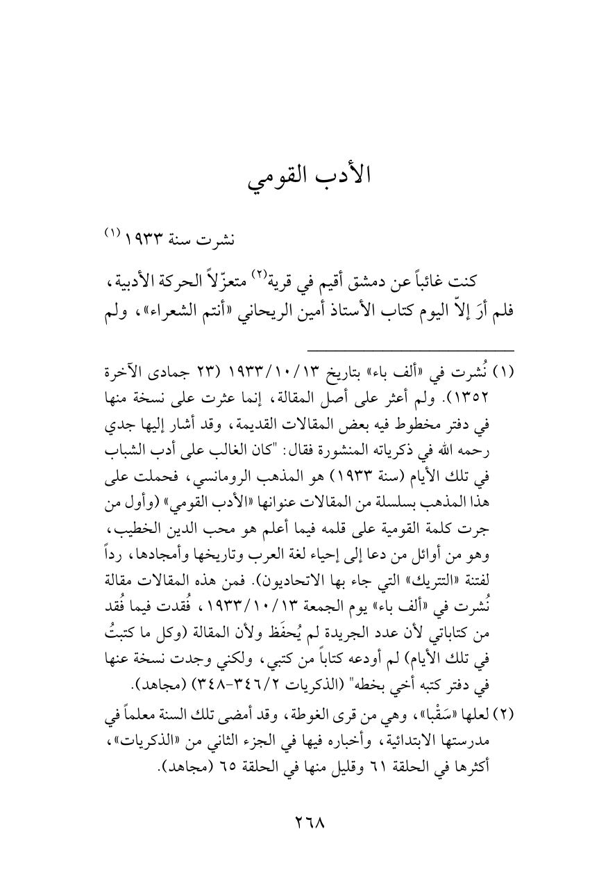 (¬1) نُشرت في «ألف باء» بتاريخ 13/ 10/1933 (23 جمادى الآخرة 1352). ولم أعثر على أصل المقالة، إنما عثرت على نسخة منها في دفتر مخطوط فيه بعض المقالات القديمة، وقد أشار إليها جدي رحمه الله في ذكرياته المنشورة فقال: "كان الغالب على أدب الشباب في تلك الأيام (سنة 1933) هو المذهب الرومانسي، فحملت على هذا المذهب بسلسلة من المقالات عنوانها «الأدب القومي» (وأول من جرت كلمة القومية على قلمه فيما أعلم هو محب الدين الخطيب، وهو من أوائل من دعا إلى إحياء لغة العرب وتاريخها وأمجادها، رداً لفتنة «التتريك» التي جاء بها الاتحاديون). فمن هذه المقالات مقالة نُشرت في «ألف باء» يوم الجمعة 13/ 10/1933، فُقدت فيما فُقد من كتاباتي لأن عدد الجريدة لم يُحفَظ ولأن المقالة (وكل ما كتبتُ في تلك الأيام) لم أودعه كتاباً من كتبي، ولكني وجدت نسخة عنها في دفتر كتبه أخي بخطه" (الذكريات 2/ 346 - 348) (مجاهد).