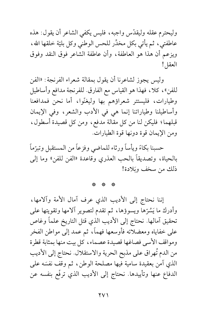 وليس يجوز لشاعرنا أن يقول بمقالة شعراء الفرنجة: «الفن للفن»، كلا، فهذا هو القياس مع الفارق. للفرنجة مدافع وأساطيل وطيارات، فليستتر شعراؤهم بها وليغنّوا، أما نحن فمدافعنا وأساطيلنا وطياراتنا إنما هي في الأدب والشعر، وفي الإيمان قبلهما؛ فليكن لنا من كل مقالة مدفع، ومن كل قصيدة أسطول، ومن الإيمان قوة دونها قوة الطيارات.