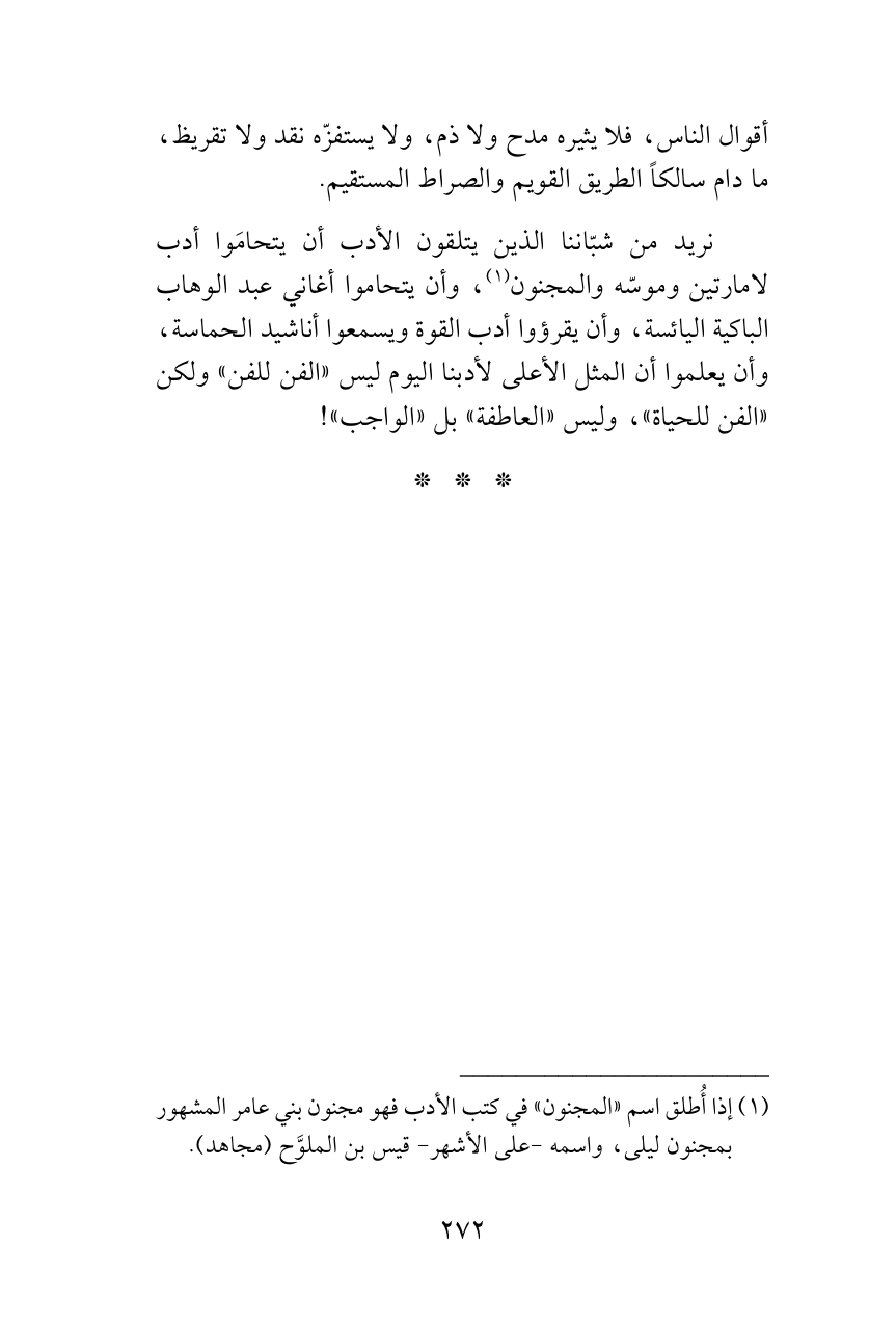 نريد من شبّاننا الذين يتلقون الأدب أن يتحامَوا أدب لامارتين وموسّه والمجنون (¬1)، وأن يتحاموا أغاني عبد الوهاب الباكية اليائسة، وأن يقرؤوا أدب القوة ويسمعوا أناشيد الحماسة، وأن يعلموا أن المثل الأعلى لأدبنا اليوم ليس «الفن للفن» ولكن «الفن للحياة»، وليس «العاطفة» بل «الواجب»!