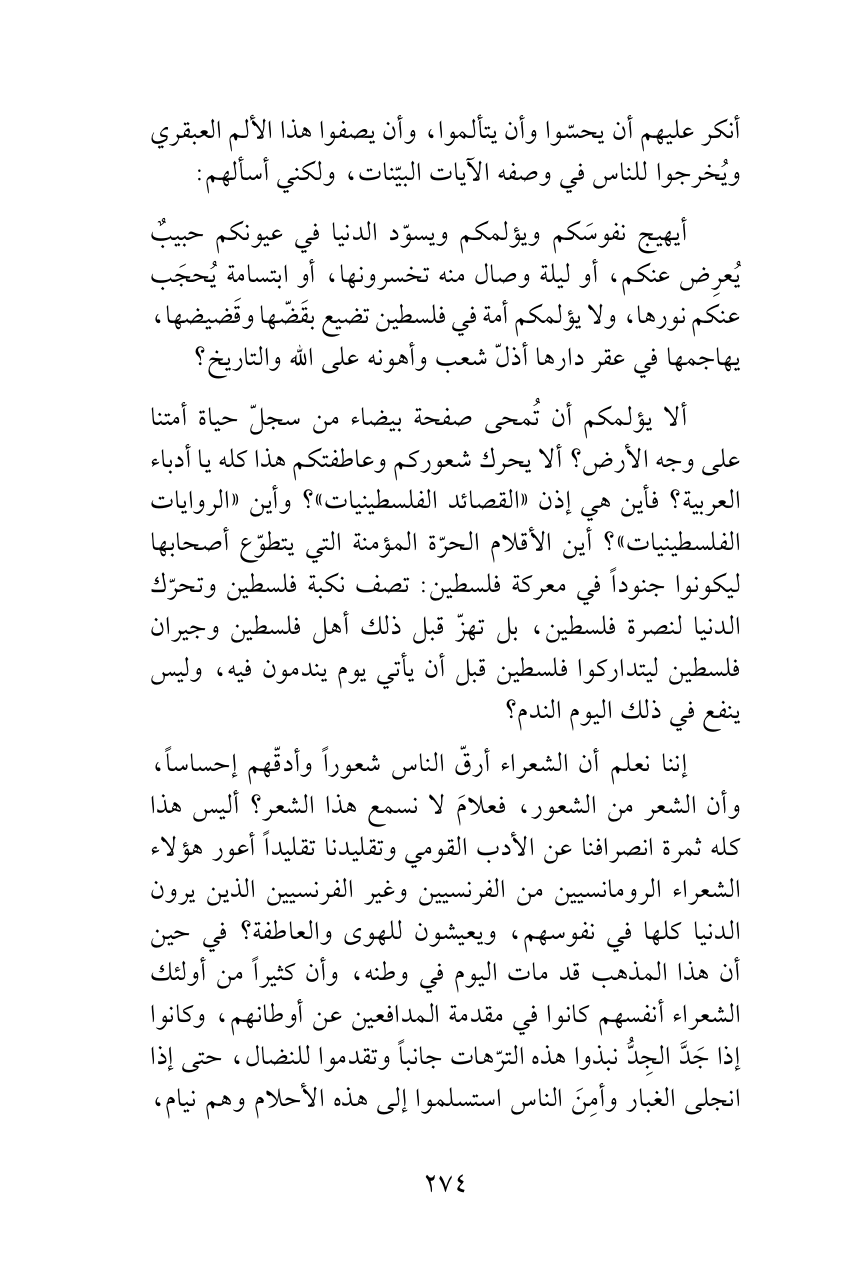 ألا يؤلمكم أن تُمحى صفحة بيضاء من سجلّ حياة أمتنا على وجه الأرض؟ ألا يحرك شعوركم وعاطفتكم هذا كله يا أدباء العربية؟ فأين هي إذن «القصائد الفلسطينيات»؟ وأين «الروايات الفلسطينيات»؟ أين الأقلام الحرّة المؤمنة التي يتطوّع أصحابها ليكونوا جنوداً في معركة فلسطين: تصف نكبة فلسطين وتحرّك الدنيا لنصرة فلسطين، بل تهزّ قبل ذلك أهل فلسطين وجيران فلسطين ليتداركوا فلسطين قبل أن يأتي يوم يندمون فيه، وليس ينفع في ذلك اليوم الندم؟