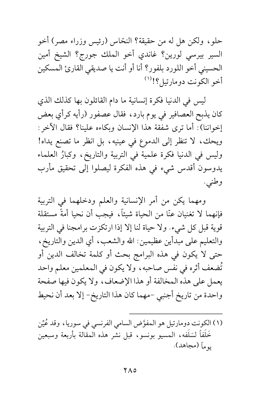 (¬1) الكونت دومارتيل هو المفوَّض السامي الفرنسي في سوريا، وقد عُيِّن خَلَفاً لسَلَفه، المسيو بونسو، قبل نشر هذه المقالة بأربعة وسبعين يوماً (مجاهد).