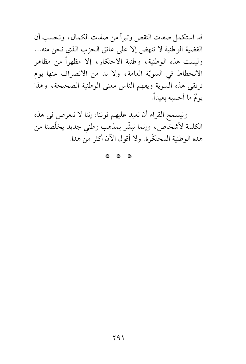 قد استكمل صفات النقص وتبرأ من صفات الكمال، ونحسب أن القضية الوطنية لا تنهض إلا على عاتق الحزب الذي نحن منه ... وليست هذه الوطنية، وطنية الاحتكار، إلا مظهراً من مظاهر الانحطاط في السويّة العامة، ولا بد من الانصراف عنها يوم ترتقي هذه السوية ويفهم الناس معنى الوطنية الصحيحة، وهذا يومٌ ما أحسبه بعيداً.
