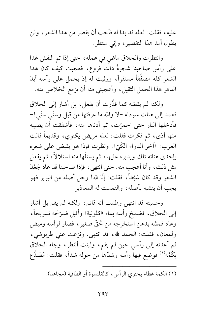ولكنه لم يقصّه كما قدَّرت أن يفعل، بل أشار إلى الحلاق فعمد إلى هنات سوداء -لا والله ما عرفتها من قبل وسنّي سنّي! - فأدخلها النار حتى احمرّت، ثم أدناها منه، فأشفقت أن يصيبه منها أذى، ثم فكرت فقلت: لعله مريض يكتوي، وقديماً قالت العرب: «آخر الدواء الكَيّ». ونظرت فإذا هو يقبض على شعره بإحدى هناته تلك ويديره عليها، ثم يستلّها منه استلالاً، ثم يفعل مثل ذلك، وأنا أعجب منه. حتى انتهى، فإذا صاحبنا قد عاد جَعْدَ الشعر وقد كان سَبْطاً، فقلت: إنّا لله! رجل أصله من البربر فهو يجب أن يتشبه بأصله، والتمست له المعاذير.