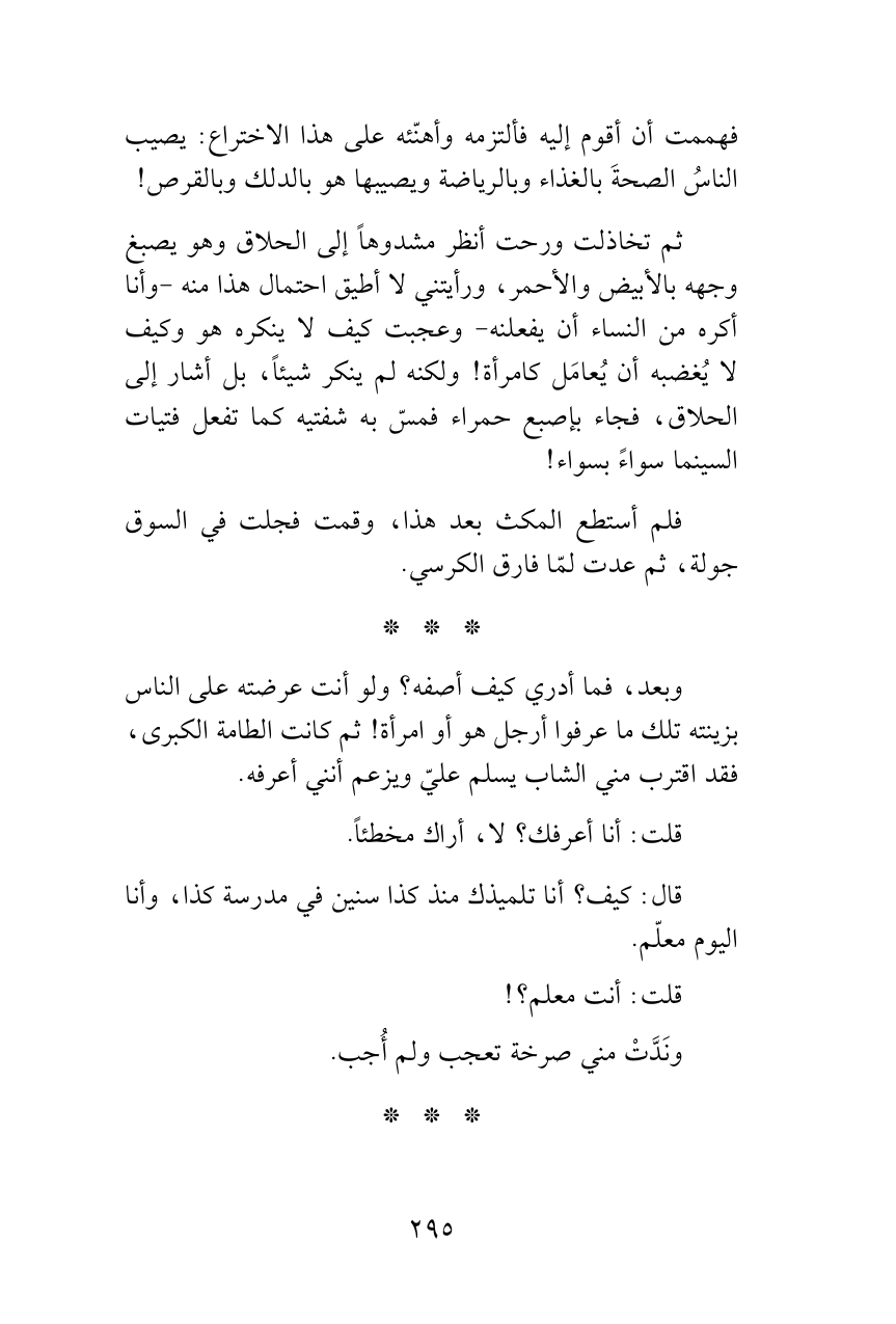 وبعد، فما أدري كيف أصفه؟ ولو أنت عرضته على الناس بزينته تلك ما عرفوا أرجل هو أو امرأة! ثم كانت الطامة الكبرى، فقد اقترب مني الشاب يسلم عليّ ويزعم أنني أعرفه.