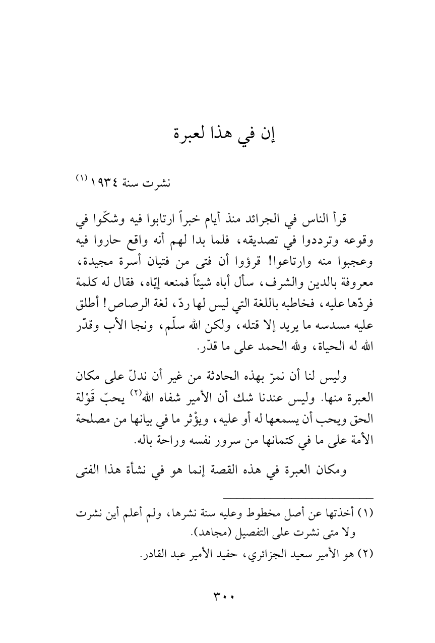 وليس لنا أن نمرّ بهذه الحادثة من غير أن ندلّ على مكان العبرة منها. وليس عندنا شك أن الأمير شفاه الله (¬2) يحبّ قَوْلة الحق ويحب أن يسمعها له أو عليه، ويؤْثر ما في بيانها من مصلحة الأمة على ما في كتمانها من سرور نفسه وراحة باله.