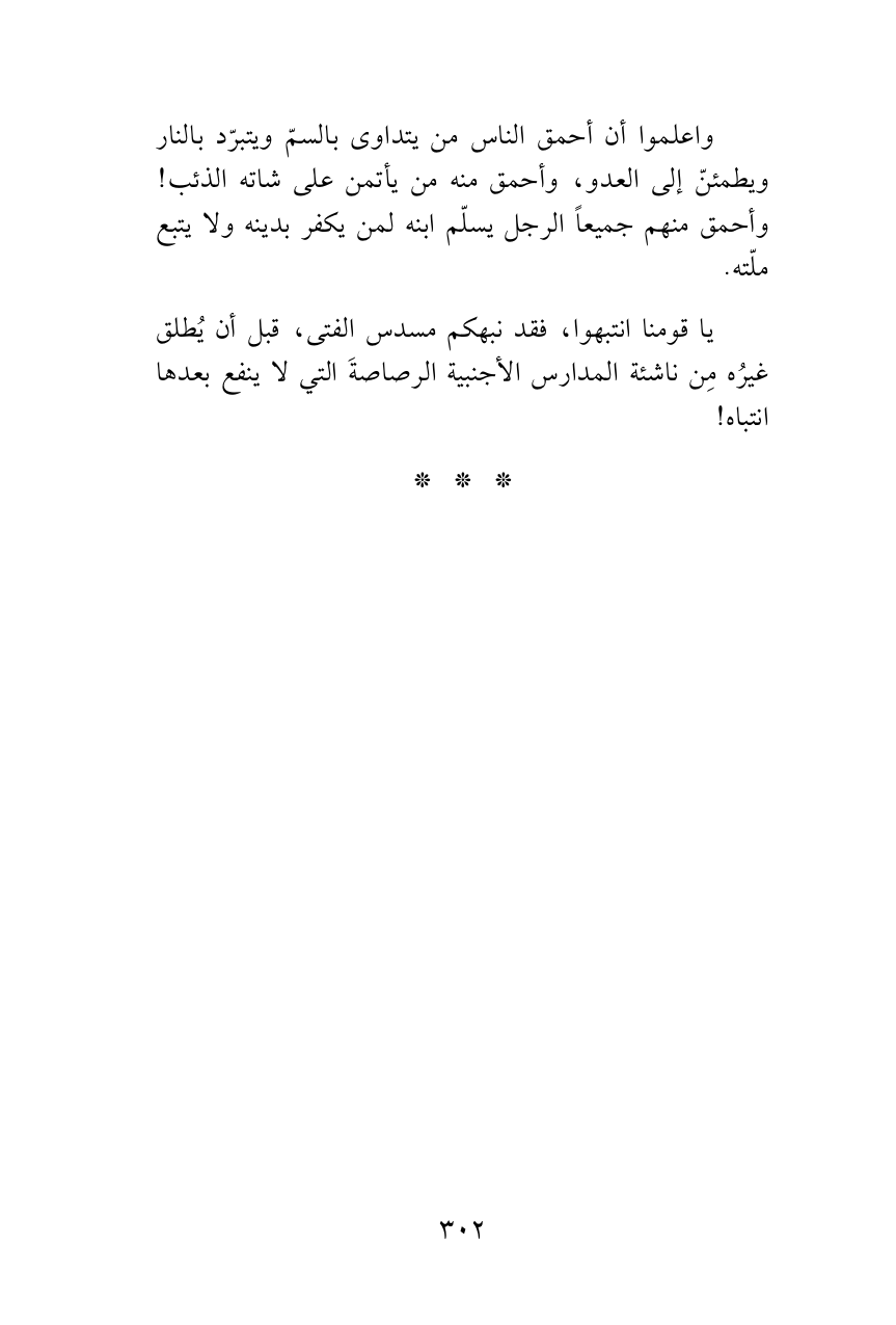 واعلموا أن أحمق الناس من يتداوى بالسمّ ويتبرّد بالنار ويطمئنّ إلى العدو، وأحمق منه من يأتمن على شاته الذئب! وأحمق منهم جميعاً الرجل يسلّم ابنه لمن يكفر بدينه ولا يتبع ملّته.