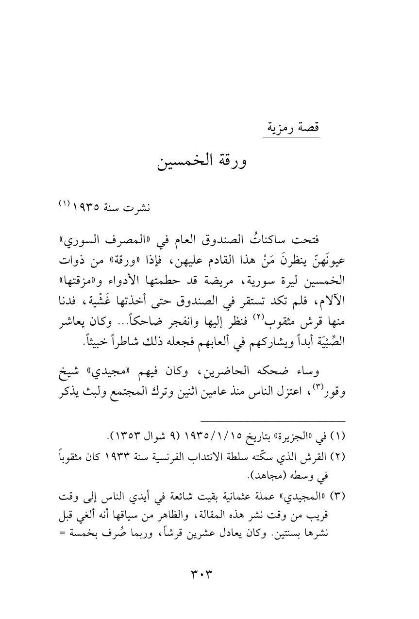 فتحت ساكناتُ الصندوق العام في «المصرف السوري» عيونَهنّ ينظرنَ مَنْ هذا القادم عليهن، فإذا «ورقة» من ذوات الخمسين ليرة سورية، مريضة قد حطمتها الأدواء و «مزقتها» الآلام، فلم تكد تستقر في الصندوق حتى أخذتها غَشْية، فدنا منها قرش مثقوب (¬2) فنظر إليها وانفجر ضاحكاً ... وكان يعاشر الصِّبْيَة أبداً ويشاركهم في ألعابهم فجعله ذلك شاطراً خبيثاً.