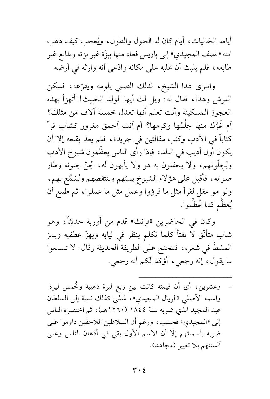 أيامه الخاليات، أيام كان له الحول والطول، ويُعجب كيف ذهب ابنه «نصف المجيدي» إلى باريس فعاد منها ببزّة غير بزته وطابع غير طابعه، فلم يلبث أن غلبه على مكانه وادّعى أنه وارثه في أرضه.