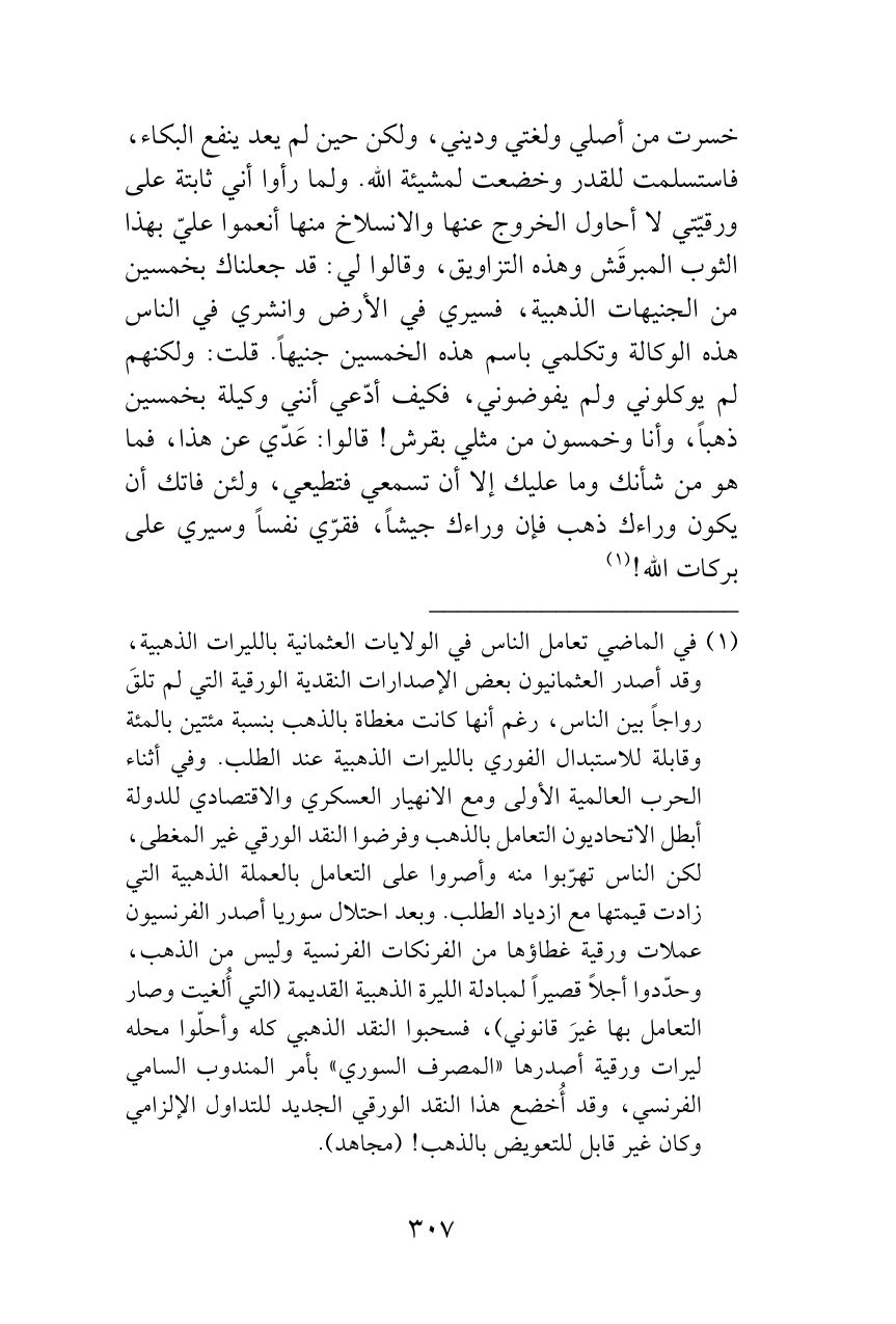 (¬1) في الماضي تعامل الناس في الولايات العثمانية بالليرات الذهبية، وقد أصدر العثمانيون بعض الإصدارات النقدية الورقية التي لم تلقَ رواجاً بين الناس، رغم أنها كانت مغطاة بالذهب بنسبة مئتين بالمئة وقابلة للاستبدال الفوري بالليرات الذهبية عند الطلب. وفي أثناء الحرب العالمية الأولى ومع الانهيار العسكري والاقتصادي للدولة أبطل الاتحاديون التعامل بالذهب وفرضوا النقد الورقي غير المغطى، لكن الناس تهرّبوا منه وأصروا على التعامل بالعملة الذهبية التي زادت قيمتها مع ازدياد الطلب. وبعد احتلال سوريا أصدر الفرنسيون عملات ورقية غطاؤها من الفرنكات الفرنسية وليس من الذهب، وحدّدوا أجلاً قصيراً لمبادلة الليرة الذهبية القديمة (التي أُلغيت وصار التعامل بها غيرَ قانوني)، فسحبوا النقد الذهبي كله وأحلّوا محله ليرات ورقية أصدرها «المصرف السوري» بأمر المندوب السامي الفرنسي، وقد أُخضع هذا النقد الورقي الجديد للتداول الإلزامي وكان غير قابل للتعويض بالذهب! (مجاهد).