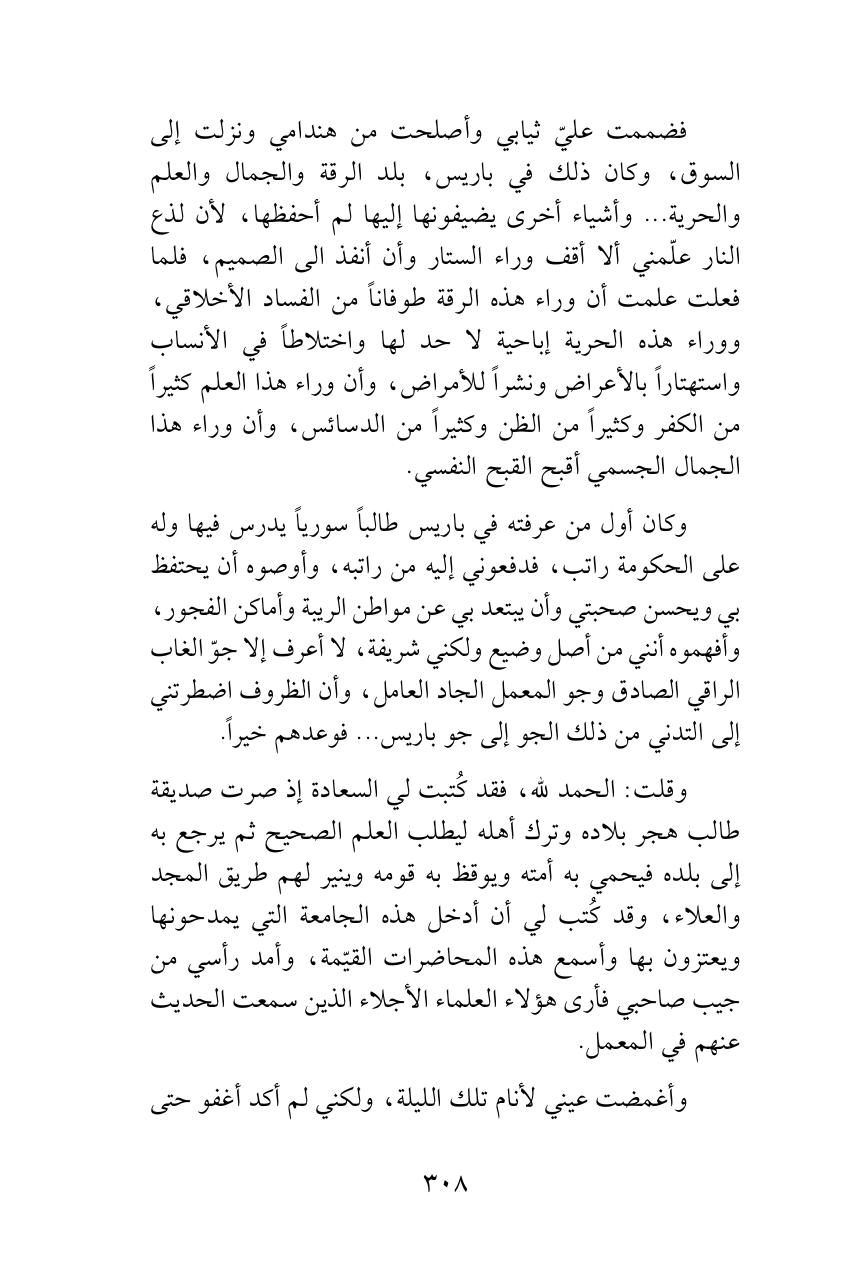 فضممت عليّ ثيابي وأصلحت من هندامي ونزلت إلى السوق، وكان ذلك في باريس، بلد الرقة والجمال والعلم والحرية ... وأشياء أخرى يضيفونها إليها لم أحفظها، لأن لذع النار علّمني ألا أقف وراء الستار وأن أنفذ الى الصميم، فلما فعلت علمت أن وراء هذه الرقة طوفاناً من الفساد الأخلاقي، ووراء هذه الحرية إباحية لا حد لها واختلاطاً في الأنساب واستهتاراً بالأعراض ونشراً للأمراض، وأن وراء هذا العلم كثيراً من الكفر وكثيراً من الظن وكثيراً من الدسائس، وأن وراء هذا الجمال الجسمي أقبح القبح النفسي.