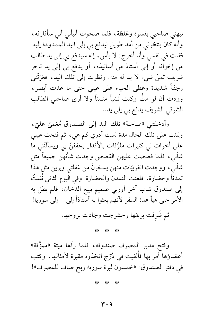 نبهني صاحبي بقسوة وغلظة، فلما صحوت أنبأني أني سأفارقه، وأنه كان ينتظرني من أمد طويل ليدفع بي إلى اليد الممدودة إليه. فقلت في نفسي وأنا أخرج: لا بأس، إنه سيدفع بي إلى يد طالب من إخوانه أو إلى أستاذ من أساتيذه، أو يدفع بي إلى يد تاجر شريف ثمنَ شيء لا بد له منه. ونظرت إلى تلك اليد، فعَرَتْني رجفةٌ شديدة وغطى الحياء على عيني حتى ما عدت أبصر، وودت أن لو متُّ وكنت نَسْياً منسيّاً ولا أرى صاحبي الطالب الشرقي الشريف يدفع بي إلى يد ...
