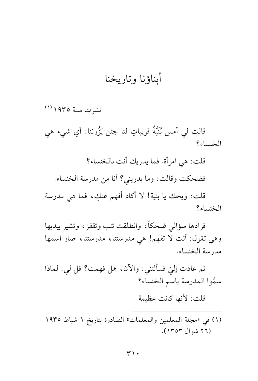 (¬1) في «مجلة المعلمين والمعلمات» الصادرة بتاريخ 1 شباط 1935 (26 شوال 1353).