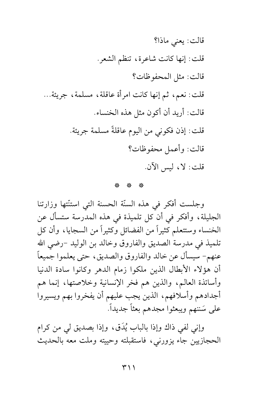 وجلست أفكر في هذه السنّة الحسنة التي استنّتها وزارتنا الجليلة، وأفكر في أن كل تلميذة في هذه المدرسة ستسأل عن الخنساء وستتعلم كثيراً من الفضائل وكثيراً من السجايا، وأن كل تلميذ في مدرسة الصديق والفاروق وخالد بن الوليد -رضي الله عنهم- سيسأل عن خالد والفاروق والصديق، حتى يعلموا جميعاً أن هؤلاء الأبطال الذين ملكوا زمام الدهر وكانوا سادة الدنيا وأساتذة العالم، والذين هم فخر الإنسانية وخلاصتها، إنما هم أجدادهم وأسلافهم، الذين يجب عليهم أن يفخروا بهم ويسيروا على سَننهم ويبعثوا مجدهم بعثاً جديداً.