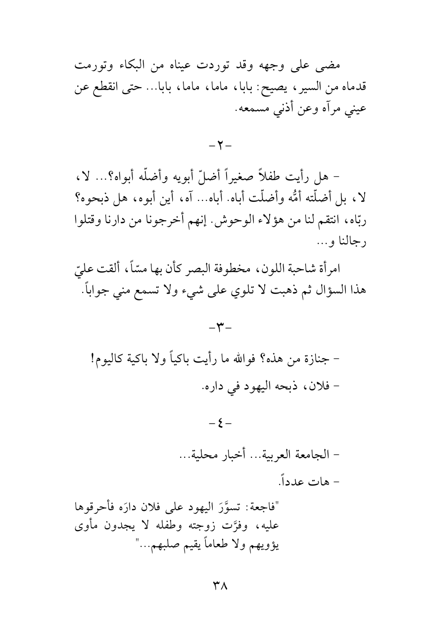 "فاجعة: تسوَّرَ اليهود على فلان دارَه فأحرقوها عليه، وفرَّت زوجته وطفله لا يجدون مأوى يؤويهم ولا طعاماً يقيم صلبهم ... "