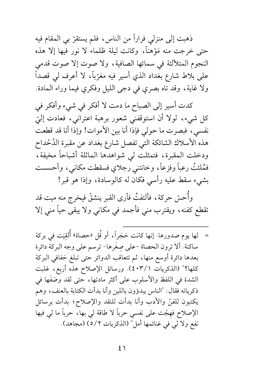 ذهبت إلى منزلي فراراً من الناس، فلم يستقرّ بي المقام فيه حتى خرجت منه مَوْهناً، وكانت ليلة ظلماء لا نور فيها إلا هذه النجوم المتلألئة في سمائها الصافية، ولا صوت إلا صوت قدمي على بلاط شارع بغداد الذي أسير فيه مغرّباً، لا أعرف لي قصداً ولا غاية، وقد تاه بصري في دجى الليل وفكري فيما وراء المادة.