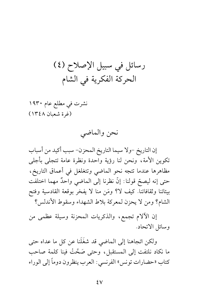 ولكن اتجاهنا إلى الماضي قد شغَلَنا عن كل ما عداه حتى ما نكاد نلتفت إلى المستقبل، وحتى صَحَّتْ فينا كلمة صاحب كتاب «حضارات تونس» الفرنسي: العرب ينظرون دوماً إلى الوراء