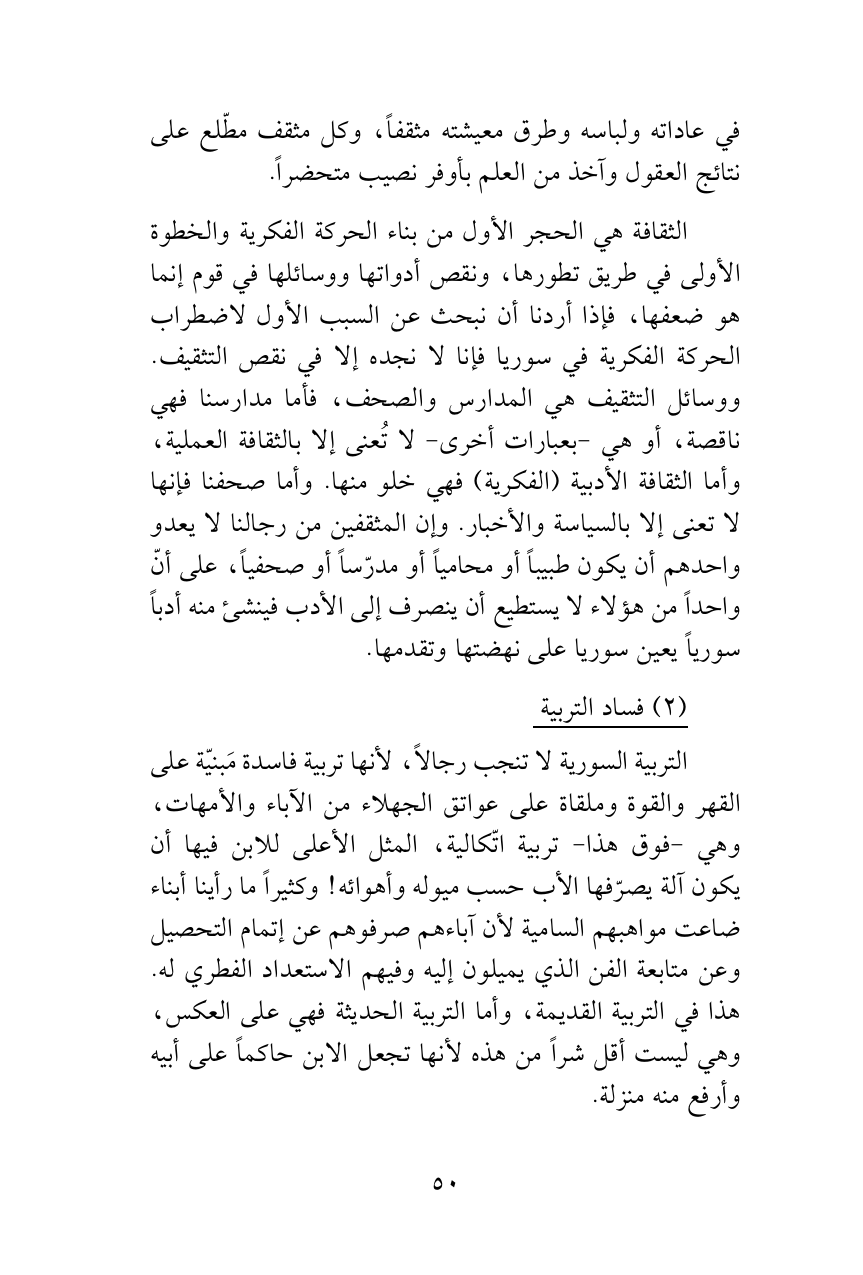 التربية السورية لا تنجب رجالاً، لأنها تربية فاسدة مَبنيّة على القهر والقوة وملقاة على عواتق الجهلاء من الآباء والأمهات، وهي -فوق هذا- تربية اتّكالية، المثل الأعلى للابن فيها أن يكون آلة يصرّفها الأب حسب ميوله وأهوائه! وكثيراً ما رأينا أبناء ضاعت مواهبهم السامية لأن آباءهم صرفوهم عن إتمام التحصيل وعن متابعة الفن الذي يميلون إليه وفيهم الاستعداد الفطري له. هذا في التربية القديمة، وأما التربية الحديثة فهي على العكس، وهي ليست أقل شراً من هذه لأنها تجعل الابن حاكماً على أبيه وأرفع منه منزلة.