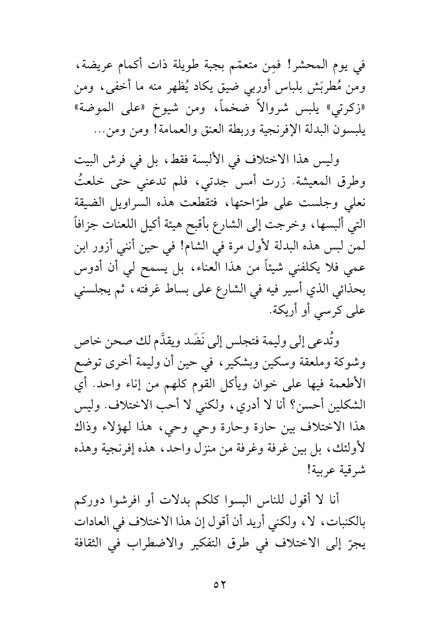 وليس هذا الاختلاف في الألبسة فقط، بل في فرش البيت وطرق المعيشة. زرت أمس جدتي، فلم تدعني حتى خلعتُ نعلي وجلست على طرّاحتها، فتقطعت هذه السراويل الضيقة التي ألبسها، وخرجت إلى الشارع بأقبح هيئة أكيل اللعنات جزافاً لمن لبس هذه البدلة لأول مرة في الشام! في حين أنني أزور ابن عمي فلا يكلفني شيئاً من هذا العناء، بل يسمح لي أن أدوس بحذائي الذي أسير فيه في الشارع على بساط غرفته، ثم يجلسني على كرسي أو أريكة.