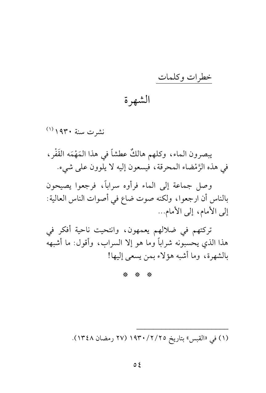 تركتهم في ضلالهم يعمهون، وانتحيت ناحية أفكر في هذا الذي يحسبونه شراباً وما هو إلا السراب، وأقول: ما أشبهه بالشهرة، وما أشبه هؤلاء بمن يسعى إليها!