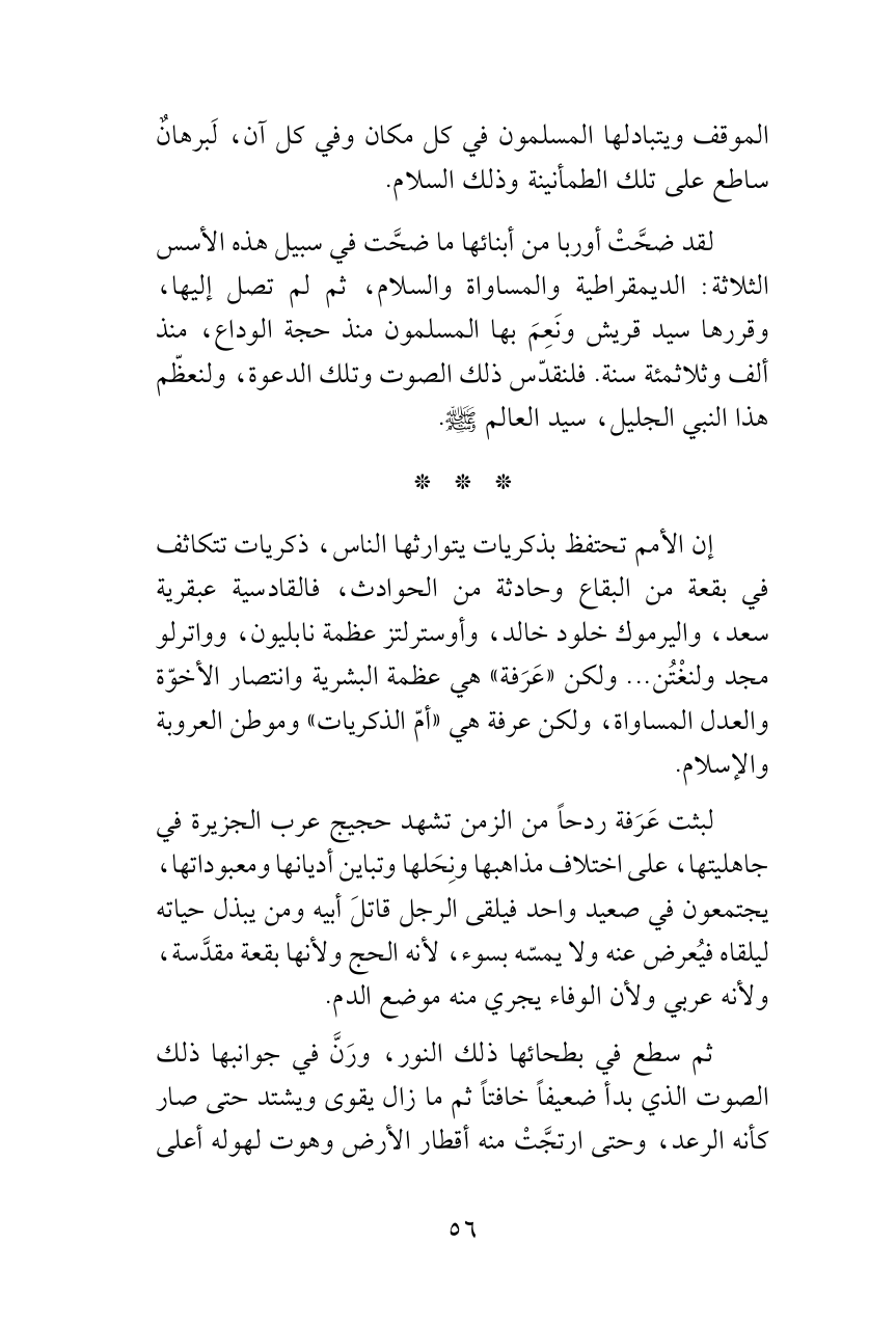 إن الأمم تحتفظ بذكريات يتوارثها الناس، ذكريات تتكاثف في بقعة من البقاع وحادثة من الحوادث، فالقادسية عبقرية سعد، واليرموك خلود خالد، وأوسترلتز عظمة نابليون، وواترلو مجد ولنغْتُن ... ولكن «عَرَفة» هي عظمة البشرية وانتصار الأخوّة والعدل المساواة، ولكن عرفة هي «أمّ الذكريات» وموطن العروبة والإسلام.