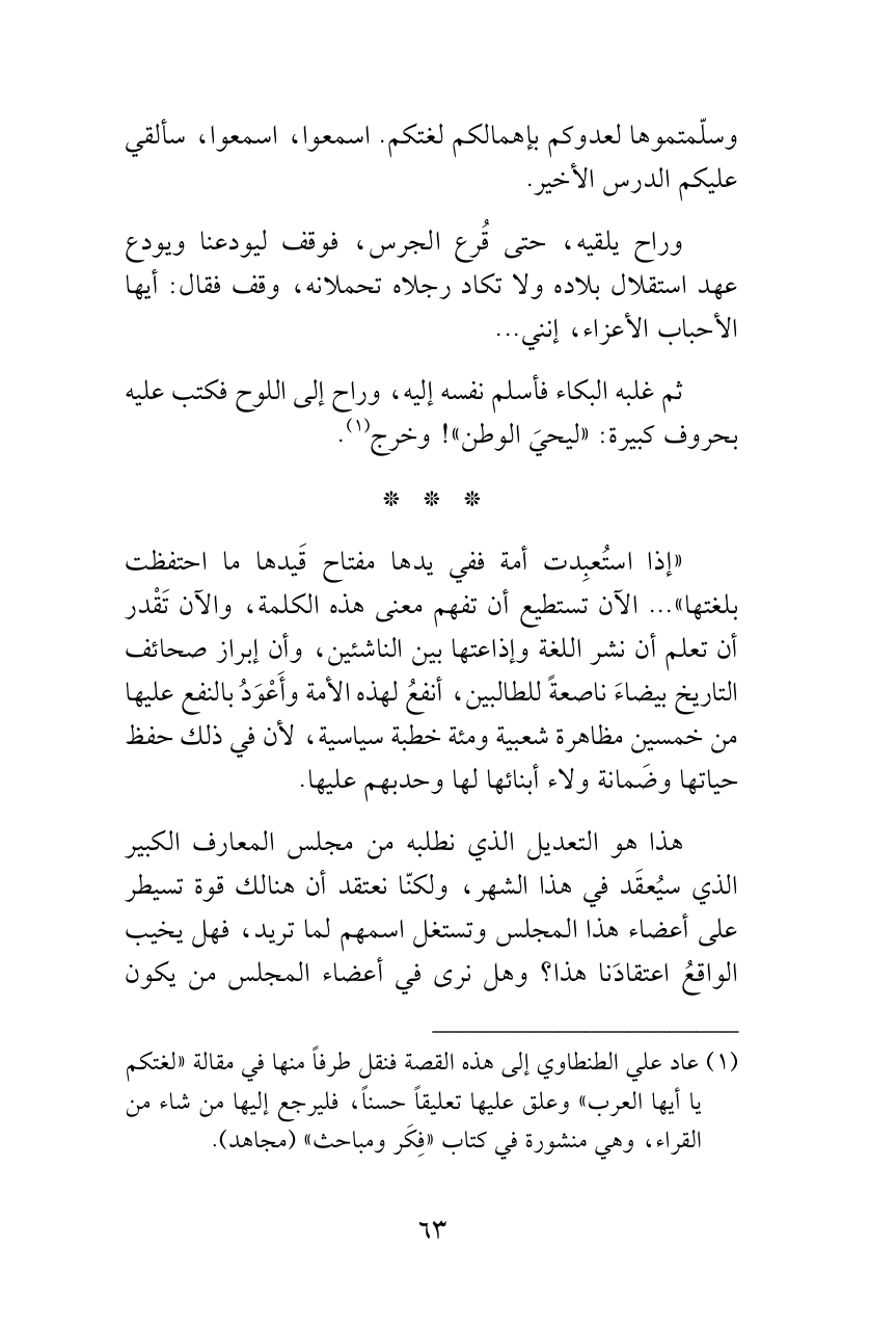 «إذا استُعبِدت أمة ففي يدها مفتاح قَيدها ما احتفظت بلغتها» ... الآن تستطيع أن تفهم معنى هذه الكلمة، والآن تَقْدر أن تعلم أن نشر اللغة وإذاعتها بين الناشئين، وأن إبراز صحائف التاريخ بيضاءَ ناصعةً للطالبين، أنفعُ لهذه الأمة وأَعْوَدُ بالنفع عليها من خمسين مظاهرة شعبية ومئة خطبة سياسية، لأن في ذلك حفظ حياتها وضَمانة ولاء أبنائها لها وحدبهم عليها.