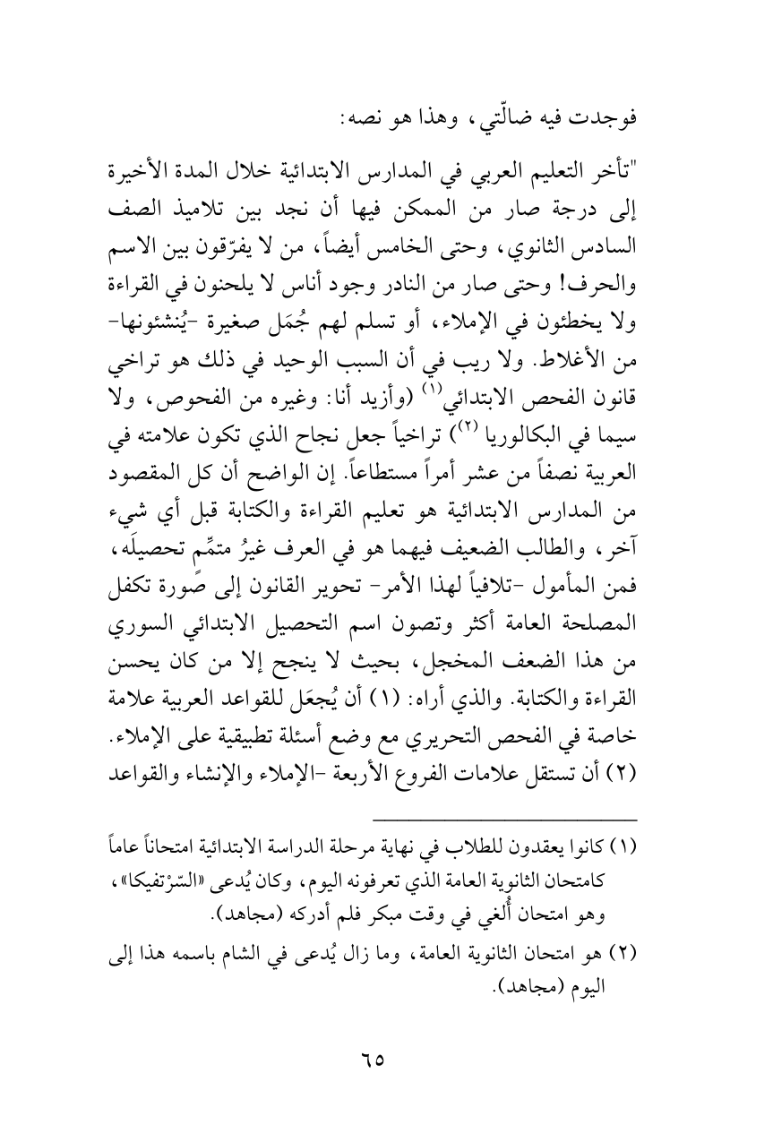 "تأخر التعليم العربي في المدارس الابتدائية خلال المدة الأخيرة إلى درجة صار من الممكن فيها أن نجد بين تلاميذ الصف السادس الثانوي، وحتى الخامس أيضاً، من لا يفرّقون بين الاسم والحرف! وحتى صار من النادر وجود أناس لا يلحنون في القراءة ولا يخطئون في الإملاء، أو تسلم لهم جُمَل صغيرة -يُنشئونها- من الأغلاط. ولا ريب في أن السبب الوحيد في ذلك هو تراخي قانون الفحص الابتدائي (¬1) (وأزيد أنا: وغيره من الفحوص، ولا سيما في البكالوريا (¬2)) تراخياً جعل نجاح الذي تكون علامته في العربية نصفاً من عشر أمراً مستطاعاً. إن الواضح أن كل المقصود من المدارس الابتدائية هو تعليم القراءة والكتابة قبل أي شيء آخر، والطالب الضعيف فيهما هو في العرف غيرُ متمِّمٍ تحصيلَه، فمن المأمول -تلافياً لهذا الأمر- تحوير القانون إلى صورة تكفل المصلحة العامة أكثر وتصون اسم التحصيل الابتدائي السوري من هذا الضعف المخجل، بحيث لا ينجح إلا من كان يحسن القراءة والكتابة. والذي أراه: (1) أن يُجعَل للقواعد العربية علامة خاصة في الفحص التحريري مع وضع أسئلة تطبيقية على الإملاء. (2) أن تستقل علامات الفروع الأربعة -الإملاء والإنشاء والقواعد