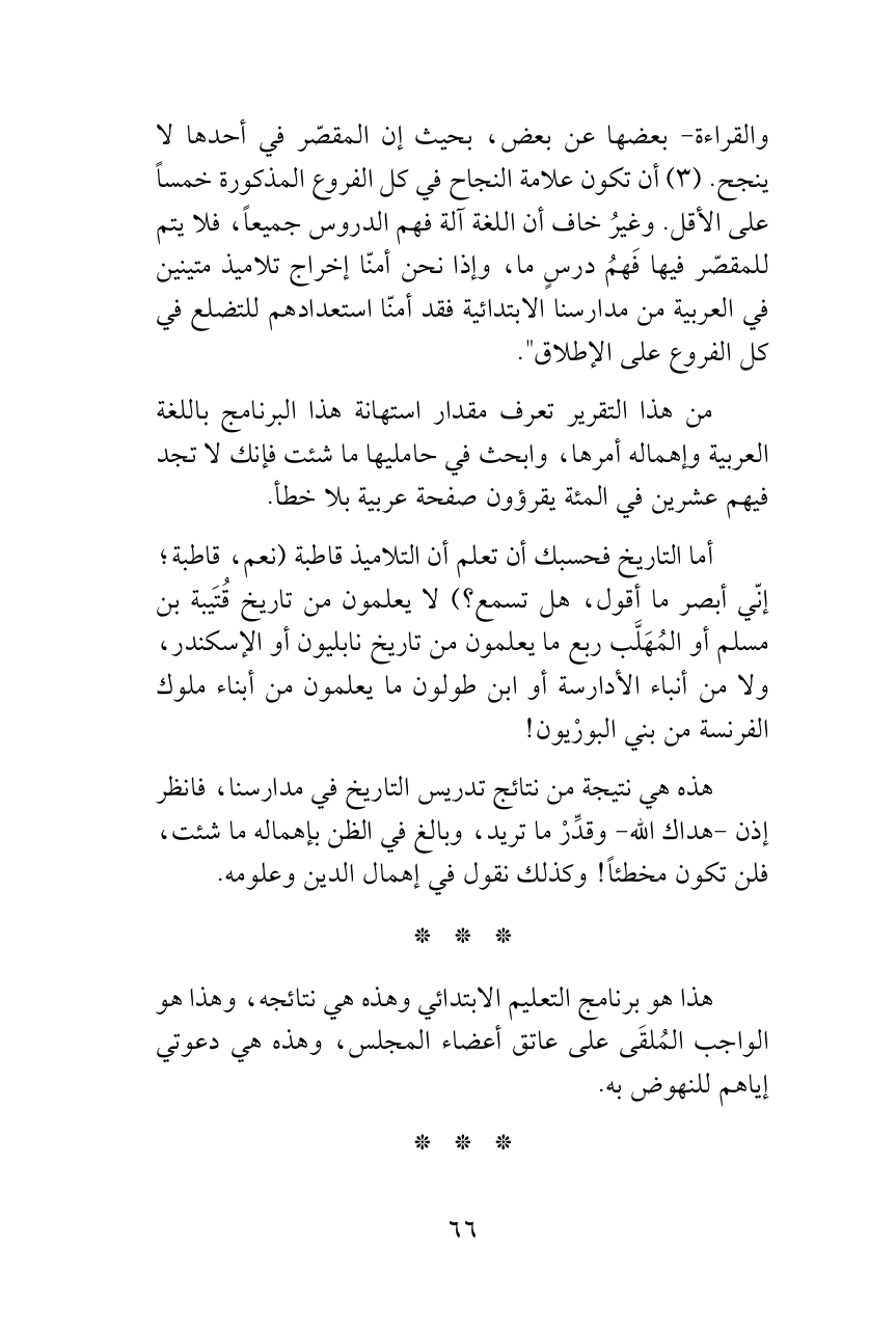 هذه هي نتيجة من نتائج تدريس التاريخ في مدارسنا، فانظر إذن -هداك الله- وقدِّرْ ما تريد، وبالغ في الظن بإهماله ما شئت، فلن تكون مخطئاً! وكذلك نقول في إهمال الدين وعلومه.