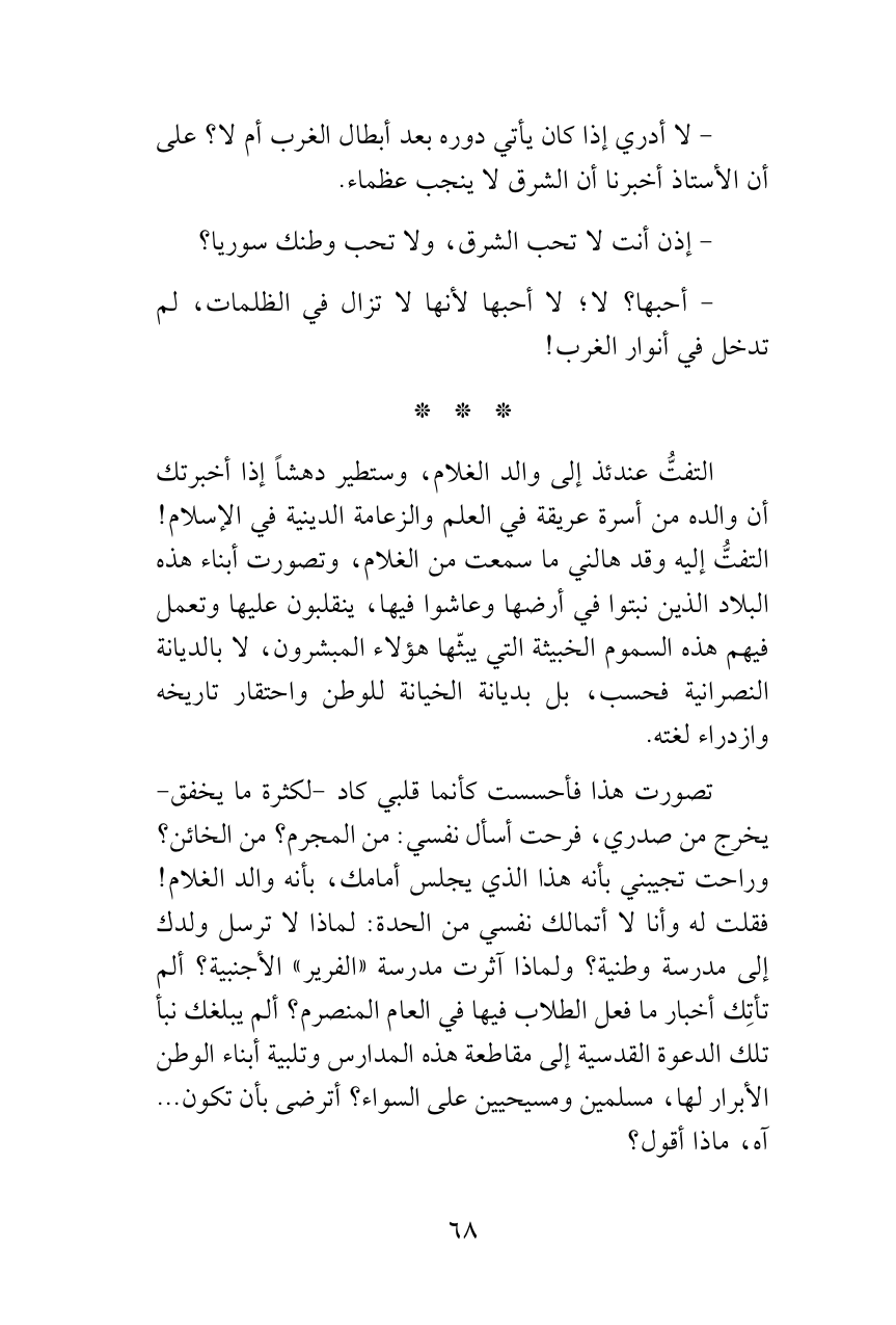 تصورت هذا فأحسست كأنما قلبي كاد -لكثرة ما يخفق- يخرج من صدري، فرحت أسأل نفسي: من المجرم؟ من الخائن؟ وراحت تجيبني بأنه هذا الذي يجلس أمامك، بأنه والد الغلام! فقلت له وأنا لا أتمالك نفسي من الحدة: لماذا لا ترسل ولدك إلى مدرسة وطنية؟ ولماذا آثرت مدرسة «الفرير» الأجنبية؟ ألم تأتِك أخبار ما فعل الطلاب فيها في العام المنصرم؟ ألم يبلغك نبأ تلك الدعوة القدسية إلى مقاطعة هذه المدارس وتلبية أبناء الوطن الأبرار لها، مسلمين ومسيحيين على السواء؟ أترضى بأن تكون ... آه، ماذا أقول؟