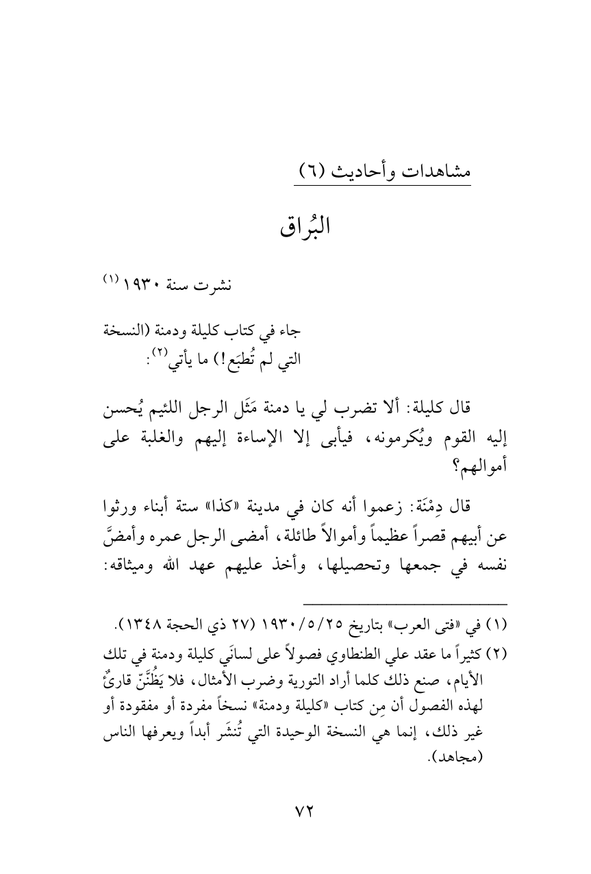 (¬2) كثيراً ما عقد علي الطنطاوي فصولاً على لسانَي كليلة ودمنة في تلك الأيام، صنع ذلك كلما أراد التورية وضرب الأمثال، فلا يَظُنَّنّ قارئٌ لهذه الفصول أن مِن كتاب «كليلة ودمنة» نسخاً مفردة أو مفقودة أو غير ذلك، إنما هي النسخة الوحيدة التي تُنشَر أبداً ويعرفها الناس (مجاهد).
