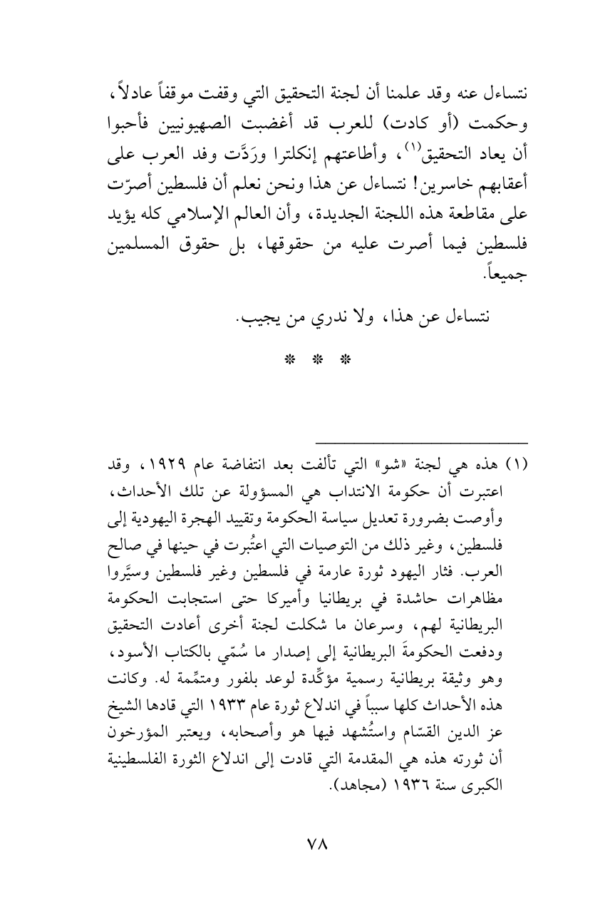 (¬1) هذه هي لجنة «شو» التي تألفت بعد انتفاضة عام 1929، وقد اعتبرت أن حكومة الانتداب هي المسؤولة عن تلك الأحداث، وأوصت بضرورة تعديل سياسة الحكومة وتقييد الهجرة اليهودية إلى فلسطين، وغير ذلك من التوصيات التي اعتُبرت في حينها في صالح العرب. فثار اليهود ثورة عارمة في فلسطين وغير فلسطين وسيَّروا مظاهرات حاشدة في بريطانيا وأميركا حتى استجابت الحكومة البريطانية لهم، وسرعان ما شكلت لجنة أخرى أعادت التحقيق ودفعت الحكومةَ البريطانية إلى إصدار ما سُمّي بالكتاب الأسود، وهو وثيقة بريطانية رسمية مؤكِّدة لوعد بلفور ومتمِّمة له. وكانت هذه الأحداث كلها سبباً في اندلاع ثورة عام 1933 التي قادها الشيخ عز الدين القسّام واستُشهد فيها هو وأصحابه، ويعتبر المؤرخون أن ثورته هذه هي المقدمة التي قادت إلى اندلاع الثورة الفلسطينية الكبرى سنة 1936 (مجاهد).