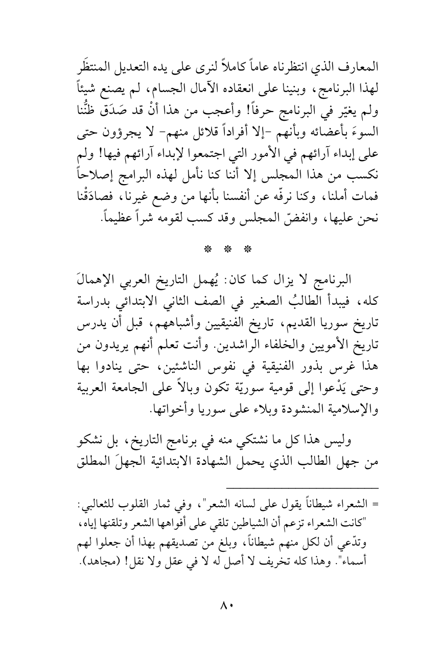 البرنامج لا يزال كما كان: يُهمل التاريخ العربي الإهمالَ كله، فيبدأ الطالبُ الصغير في الصف الثاني الابتدائي بدراسة تاريخ سوريا القديم، تاريخ الفنيقيين وأشباههم، قبل أن يدرس تاريخ الأمويين والخلفاء الراشدين. وأنت تعلم أنهم يريدون من هذا غرس بذور الفنيقية في نفوس الناشئين، حتى ينادوا بها وحتى يَدْعوا إلى قومية سوريّة تكون وبالاً على الجامعة العربية والإسلامية المنشودة وبلاء على سوريا وأخواتها.
