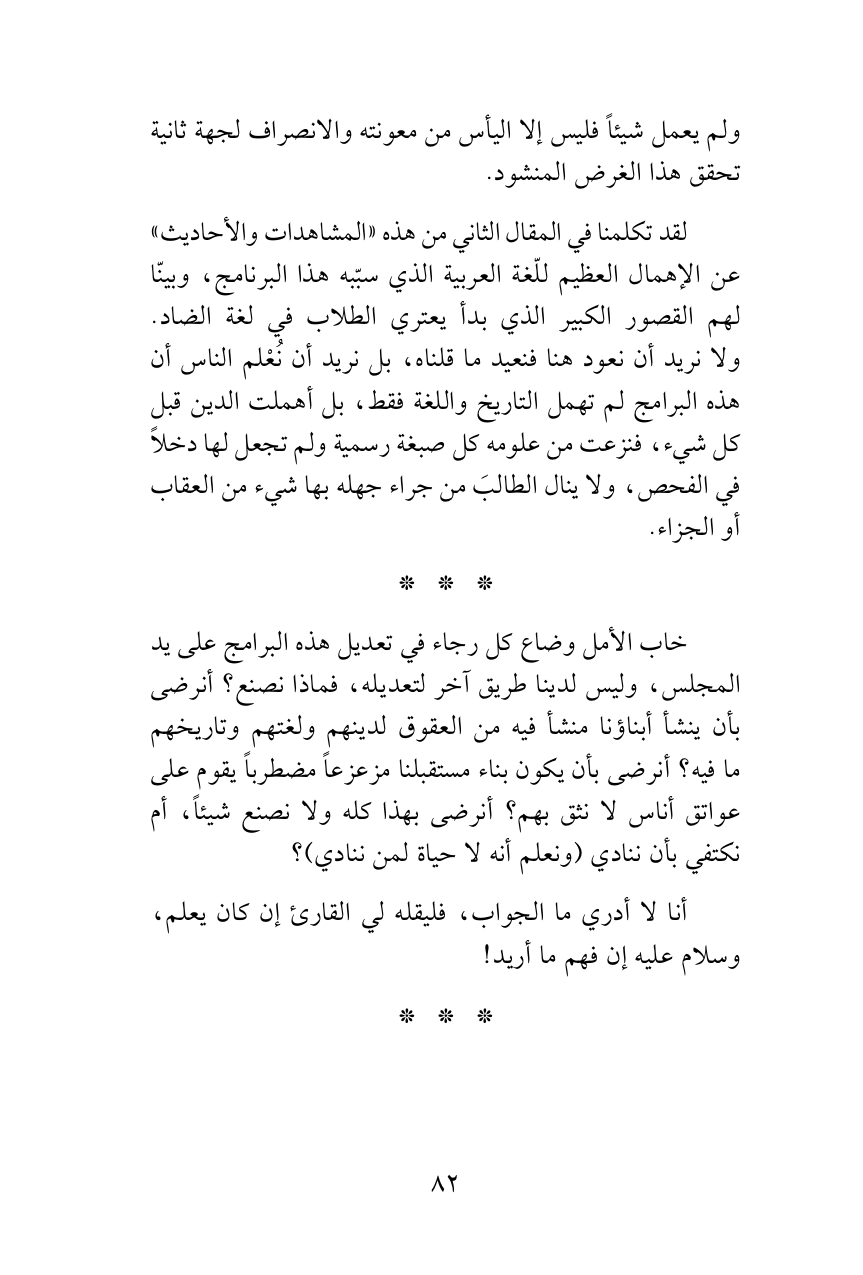 خاب الأمل وضاع كل رجاء في تعديل هذه البرامج على يد المجلس، وليس لدينا طريق آخر لتعديله، فماذا نصنع؟ أنرضى بأن ينشأ أبناؤنا منشأ فيه من العقوق لدينهم ولغتهم وتاريخهم ما فيه؟ أنرضى بأن يكون بناء مستقبلنا مزعزعاً مضطرباً يقوم على عواتق أناس لا نثق بهم؟ أنرضى بهذا كله ولا نصنع شيئاً، أم نكتفي بأن ننادي (ونعلم أنه لا حياة لمن ننادي)؟