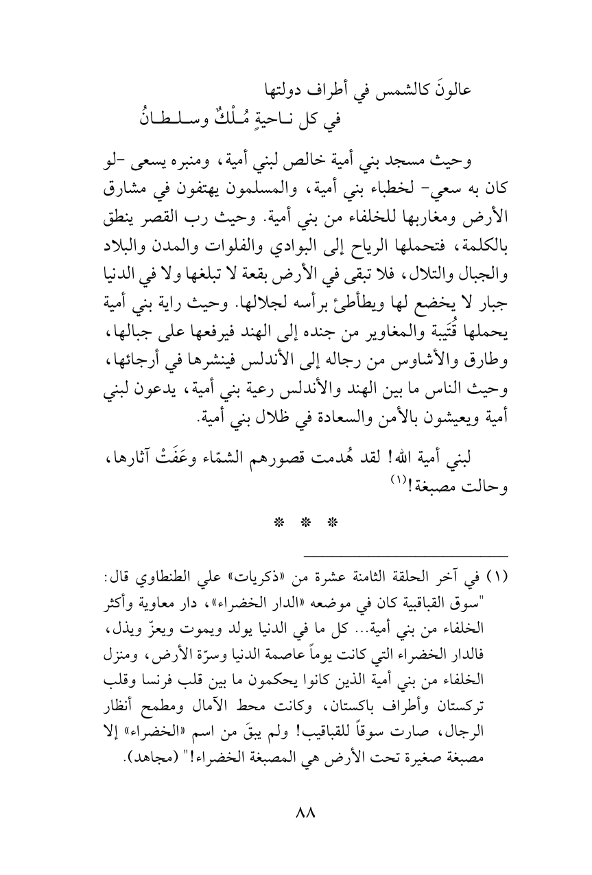 وحيث مسجد بني أمية خالص لبني أمية، ومنبره يسعى -لو كان به سعي- لخطباء بني أمية، والمسلمون يهتفون في مشارق الأرض ومغاربها للخلفاء من بني أمية. وحيث رب القصر ينطق بالكلمة، فتحملها الرياح إلى البوادي والفلوات والمدن والبلاد والجبال والتلال، فلا تبقى في الأرض بقعة لا تبلغها ولا في الدنيا جبار لا يخضع لها ويطأطئ برأسه لجلالها. وحيث راية بني أمية يحملها قُتَيبة والمغاوير من جنده إلى الهند فيرفعها على جبالها، وطارق والأشاوس من رجاله إلى الأندلس فينشرها في أرجائها، وحيث الناس ما بين الهند والأندلس رعية بني أمية، يدعون لبني أمية ويعيشون بالأمن والسعادة في ظلال بني أمية.