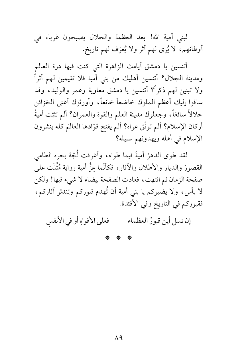 أتنسين يا دمشق أيامك الزاهرة التي كنت فيها درة العالم ومدينة الجلال؟ أتنسين أهليك من بني أمية فلا تقيمين لهم أثراً ولا تبنين لهم ذكراً؟ أتنسين يا دمشق معاوية وعمر والوليد، وقد ساقوا إليك أعظم الملوك خاضعاً خانعاً، وأورثوك أغنى الخزائن حلالاً سائغاً، وجعلوك مدينة العلم والقوة والعمران؟ ألم تثبّت أميةُ أركان الإسلام؟ ألم توثّق عراه؟ ألم يفتح قوّادها العالمَ كله ينشرون الإسلام في أهله ويهدونهم سبيله؟