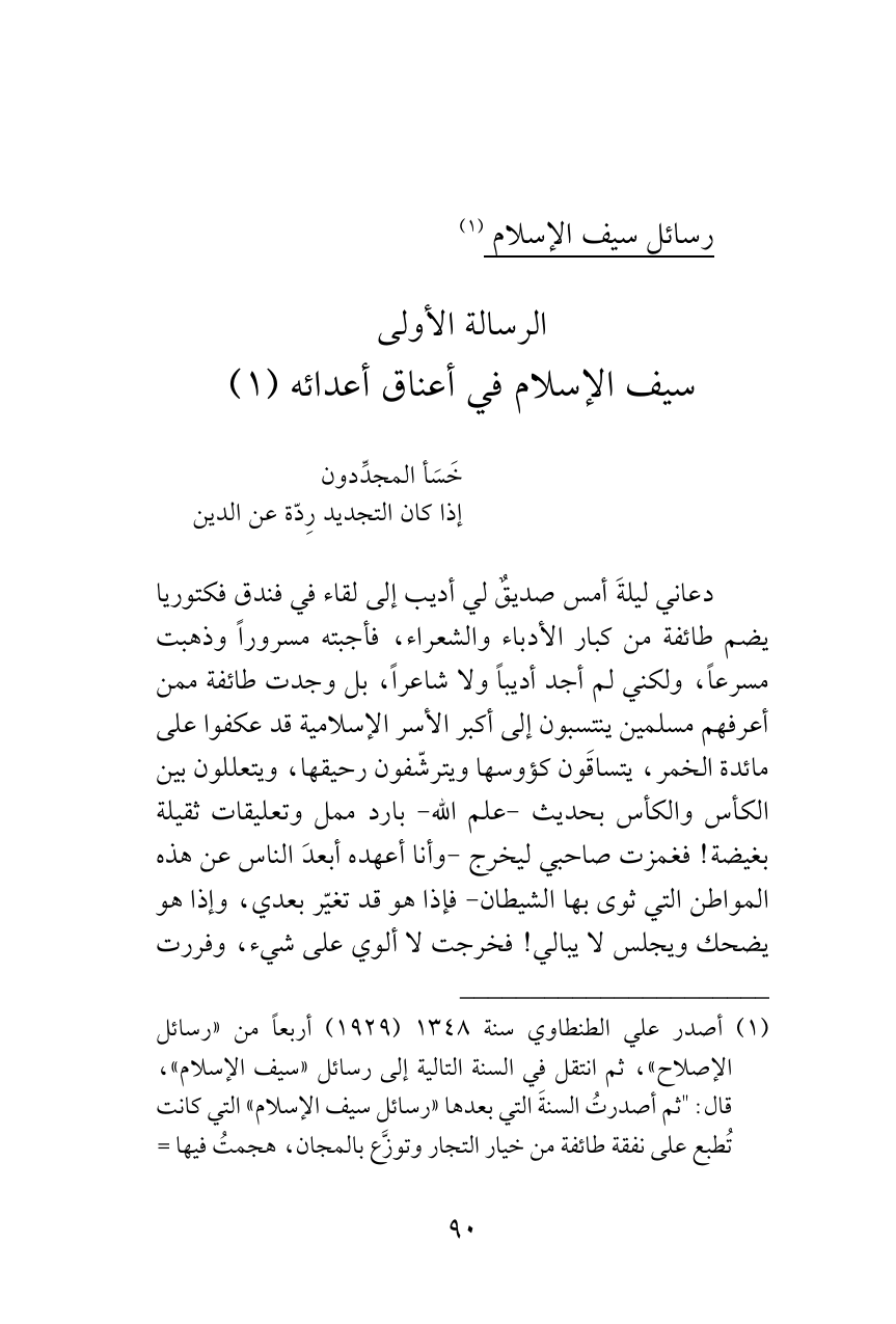 (¬1) أصدر علي الطنطاوي سنة 1348 (1929) أربعاً من «رسائل الإصلاح»، ثم انتقل في السنة التالية إلى رسائل «سيف الإسلام»، قال: "ثم أصدرتُ السنةَ التي بعدها «رسائل سيف الإسلام» التي كانت تُطبع على نفقة طائفة من خيار التجار وتوزَّع بالمجان، هجمتُ فيها =