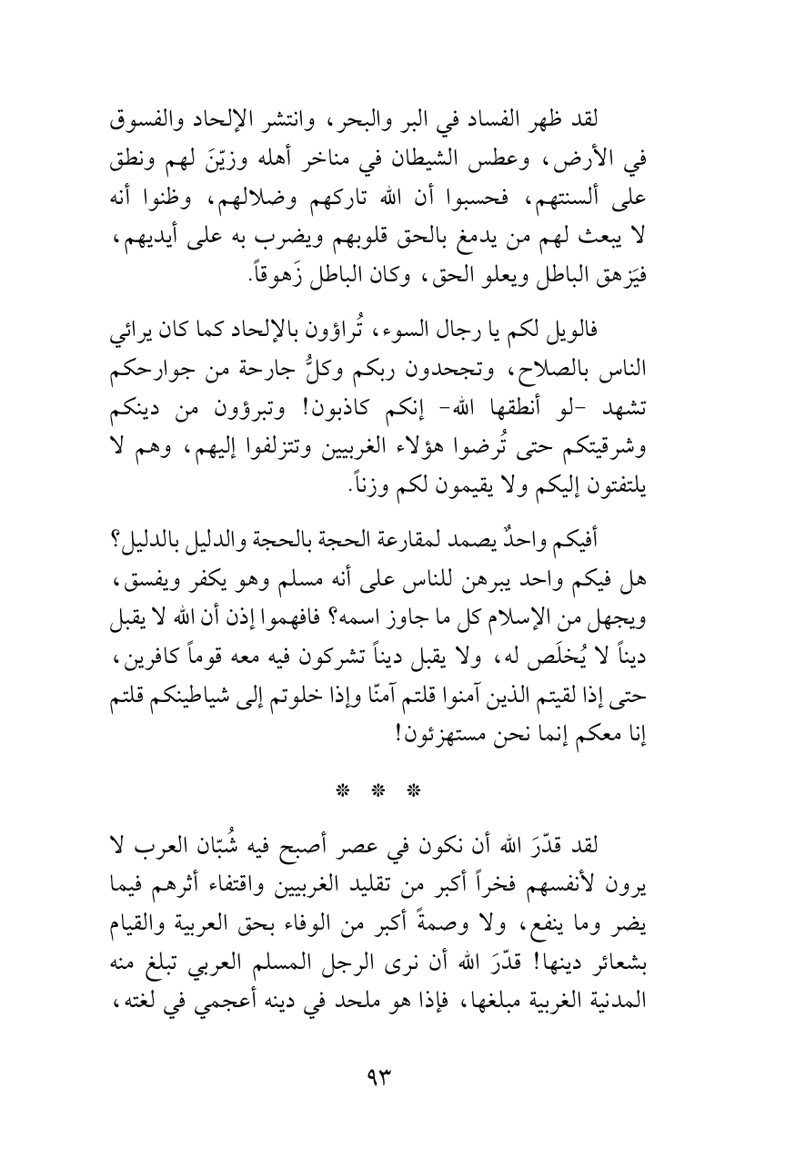 لقد قدّرَ الله أن نكون في عصر أصبح فيه شُبّان العرب لا يرون لأنفسهم فخراً أكبر من تقليد الغربيين واقتفاء أثرهم فيما يضر وما ينفع، ولا وصمةً أكبر من الوفاء بحق العربية والقيام بشعائر دينها! قدّرَ الله أن نرى الرجل المسلم العربي تبلغ منه المدنية الغربية مبلغها، فإذا هو ملحد في دينه أعجمي في لغته،