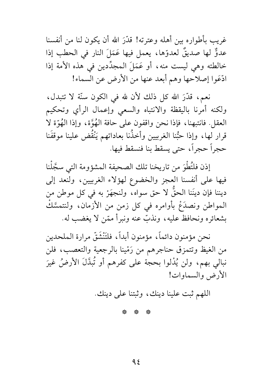 إذن فلتُطْوَ من تاريخنا تلك الصحيفة المشؤومة التي سجَّلْنا فيها على أنفسنا العجز والخضوع لهؤلاء الغربيين، ولنعد إلى ديننا فإن دينَنا الحقُّ لا حق سواه، ولنجهَرْ به في كل موطن من المواطن ونصدَعْ بأوامره في كل زمن من الأزمان، ولنتمسَّكْ بشعائره ونحافظ عليه، ونذبّ عنه ونبرأ ممّن لا يغضب له.